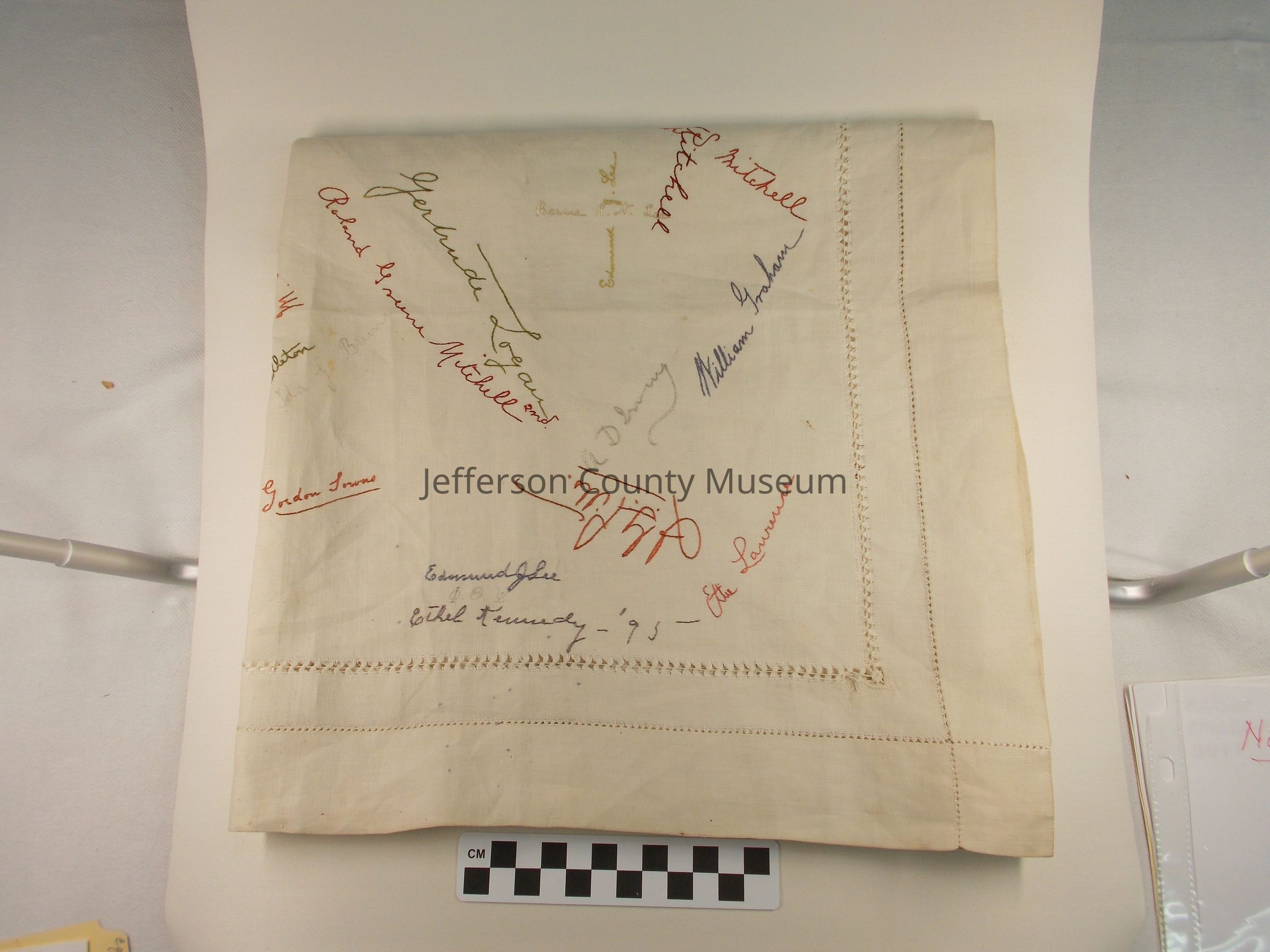Linen "signature" cloth from the Bower, circa 1900. Among the names are Thomas Nelson Page (author), George W. Peterkin, first Episcopal Bishop of West Virginia, and members of the Dandridge, Pendleton, and Lee families. Names are entered in "People" section.