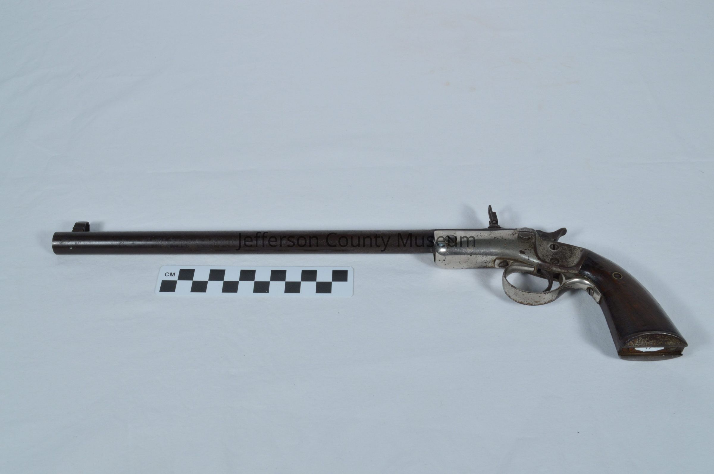 Pistol, Massachusetts: Long Barrelled Pistol marked on barrel near collapsible sight. Marked "J. Stevens. A & TC Chicopee Falls Mass. U.S." Nickle-plating worn, walnut butt.Acquisition