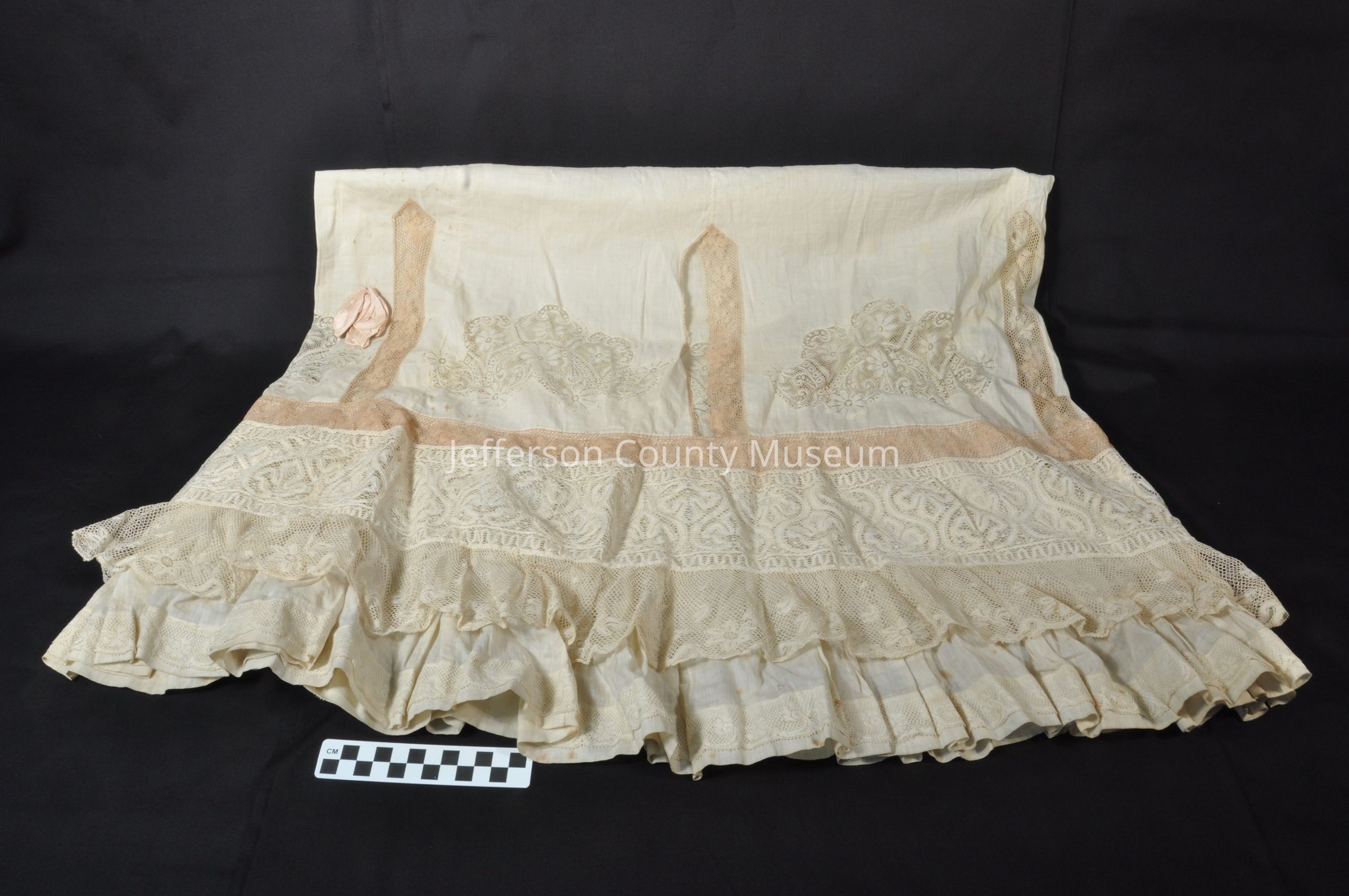 Long petticoat, probably cotton with lace panels. Pink satin flower sewn near bottom on one side. Was probably white at one time but is now beige or cream colored.