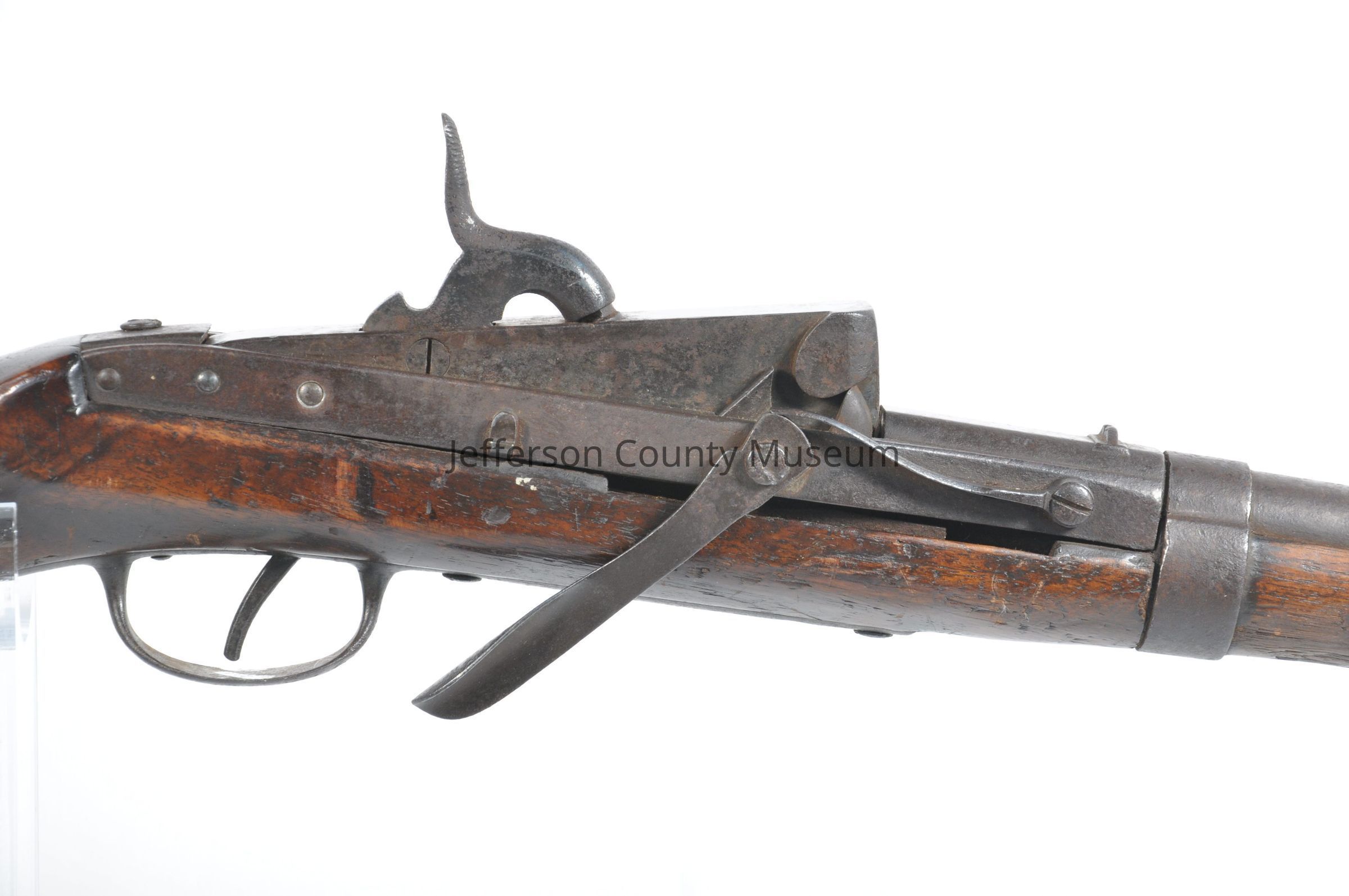 Middletown, Connecticut, carbine in the style of the Hall's breech-loading rifle. Rod attached to left side for saddle ring but ring is missing. Breech opening mechanism differs from the Hall's in that it is a lever on the right side which rotates and is held tight by a leaf spring. Marked on top of breech block "S. NO MIDL. CO." (Simeon North, Middletown, Conn.). North manufactured Hall rifles under contract with the U.S. government.