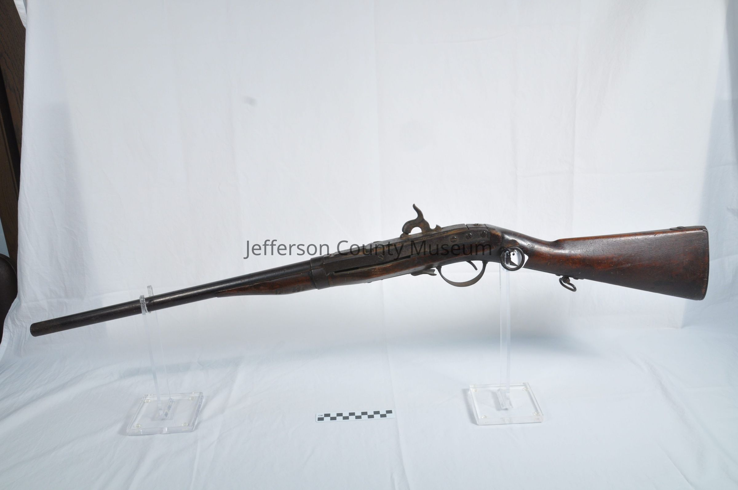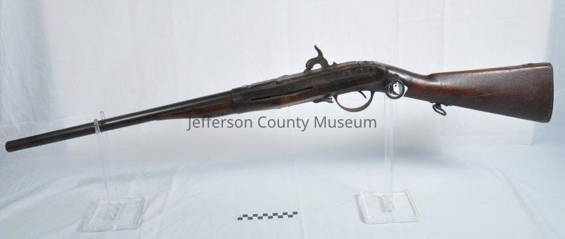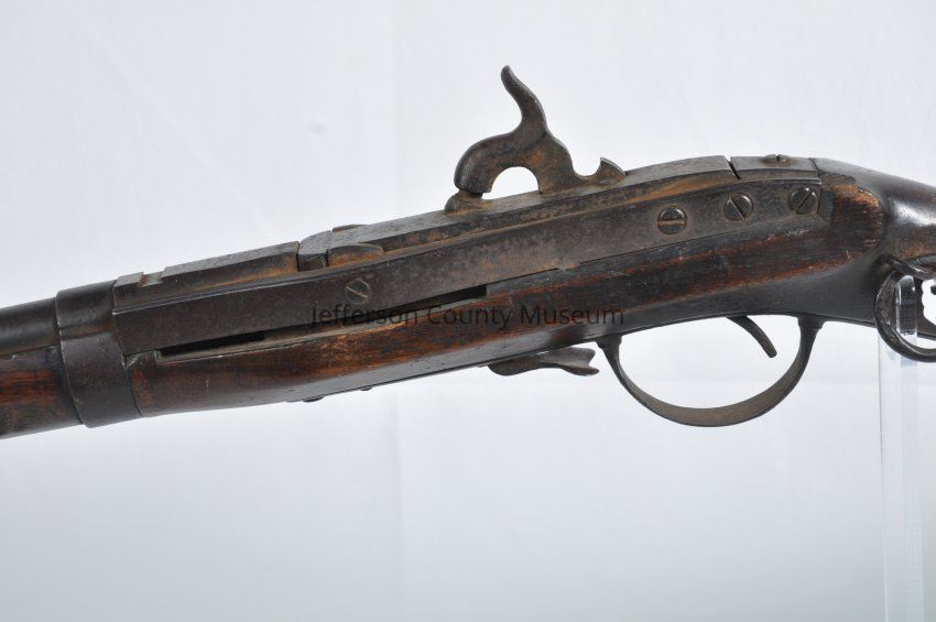 Model 1841 Hall rifle. Marked on top of breech block "H. FERRY US 1841". Metal saddle ring on left side of stock. Front of stock crudely cut down to shorten it.
