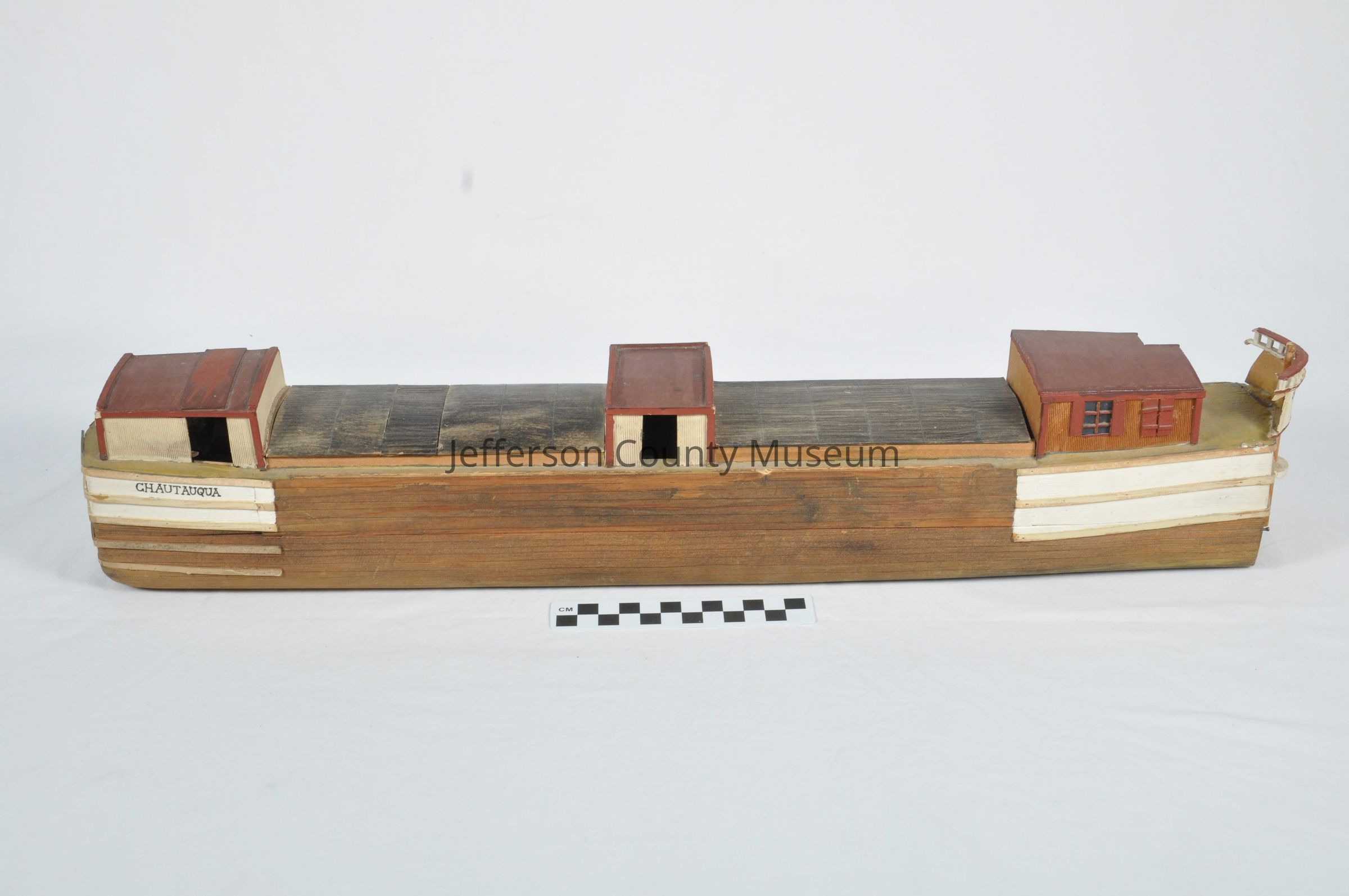 Model of Chesapeake & Ohio Canal boat. Model is accurate in detail with three cabins. Front cabin was for mules, center cabin for hay storage and back cabin for captain's family. Cabins are painted with red roofs, hatch covers are black, front and rear top part of hull is painted white. Boat name "CHAUTAUQUA" is painted on front of boat on both sides. On back of boat in black paint is "CANAL TOWAGE Co No60". On bottom of boat is written in black marker "DO NOT FLOAT: MADE WITH WATER SOLUABLE (sic) GLUE".Acquisition