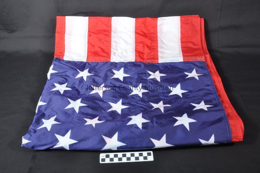 Nylon red, white and blue American flag. Two brass grommets for hanging. Stamped in black ink near one grommet "U.S. PROPERTY". Fifty stars are not embroidered.Acquisition