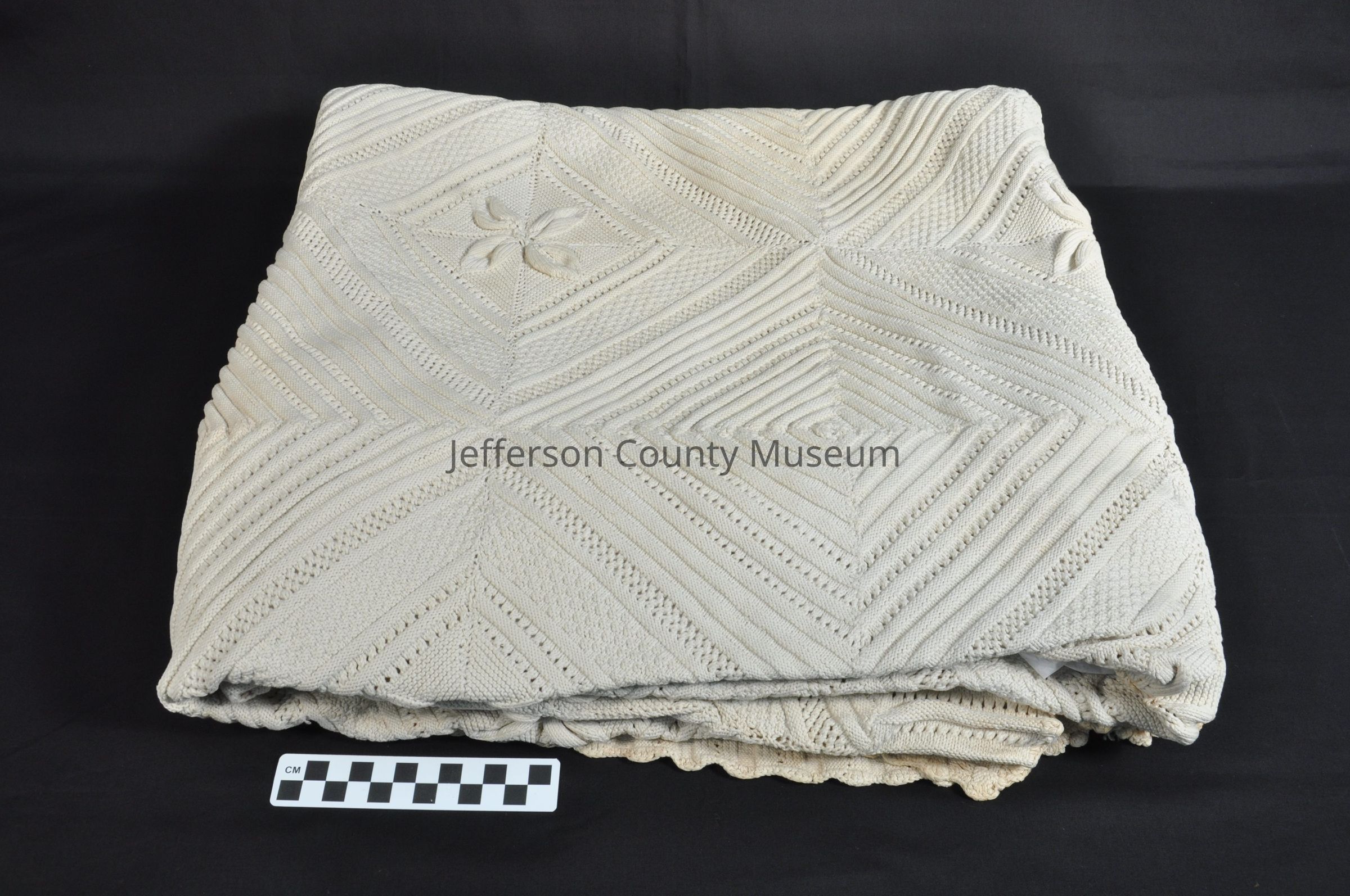 Off-white, probably once white heavy cotton coverlet with square patterns throughout. Alternating squares have a flower in the center.Acquisition