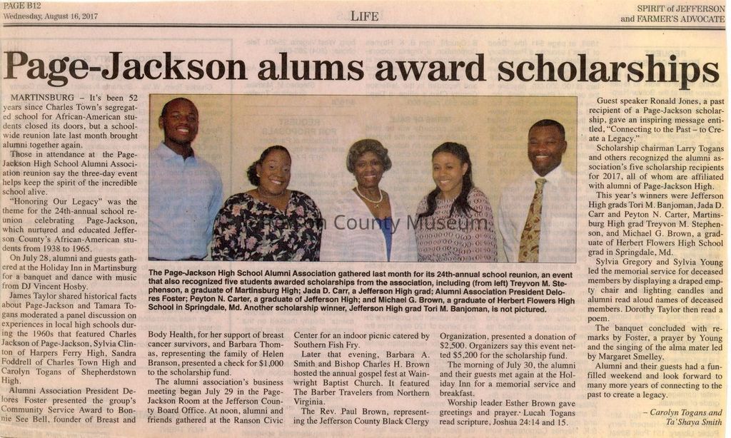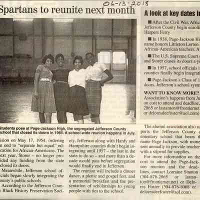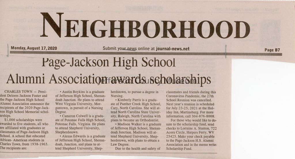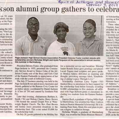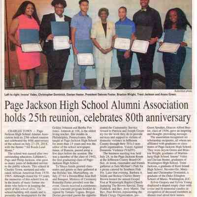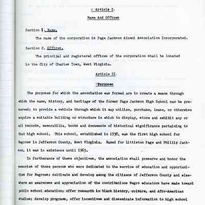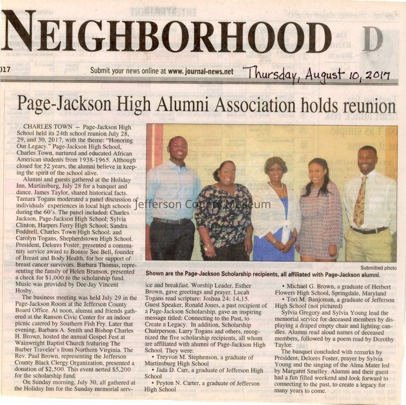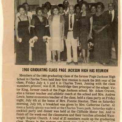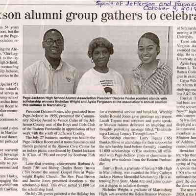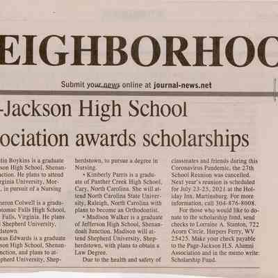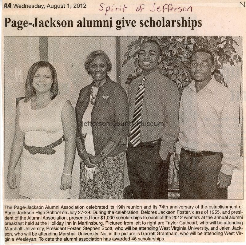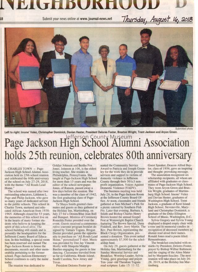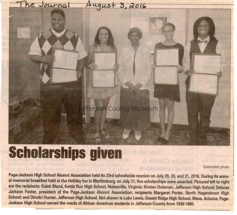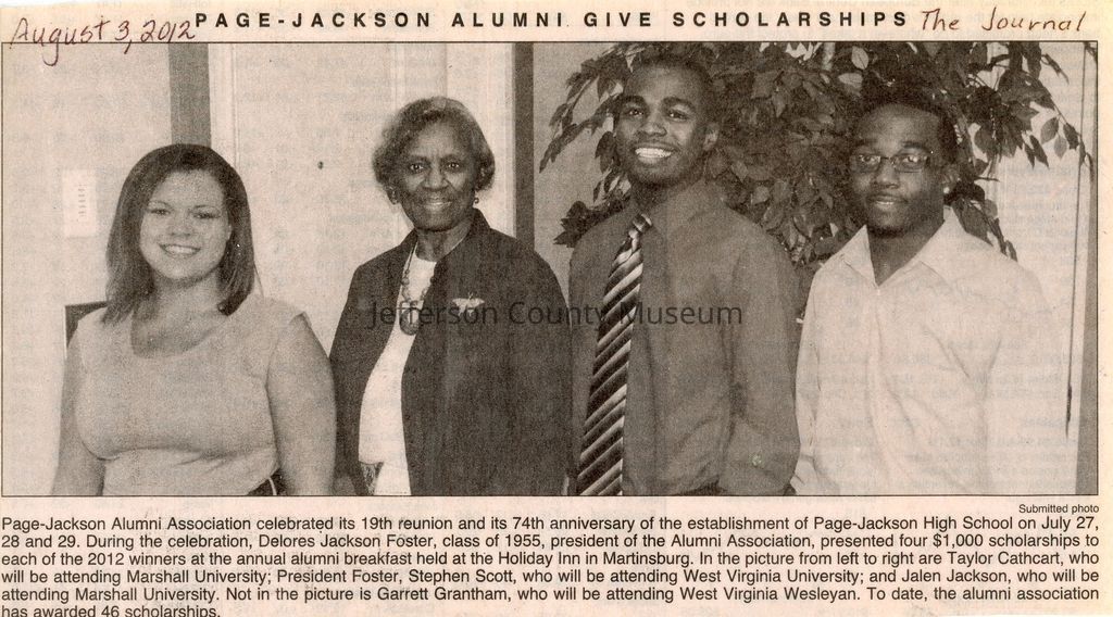 Digital images, bylaws, and newspaper clippings (most from the Spirit of Jefferson and Martinsburg Journal) from Page Jackson Alumni Association reunions and their annual scholarship program.Acquisition