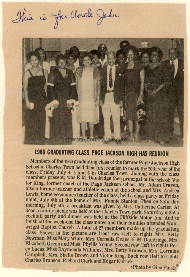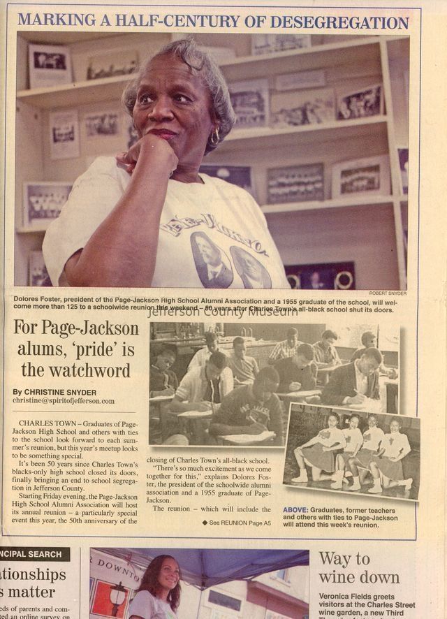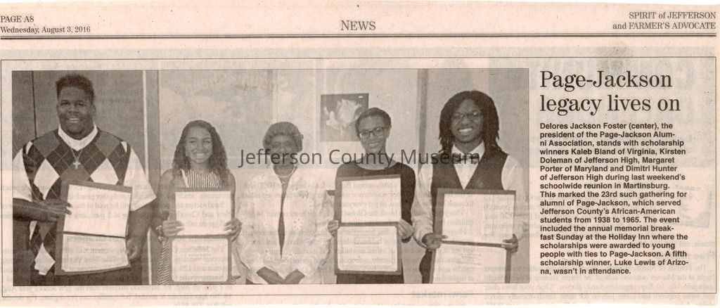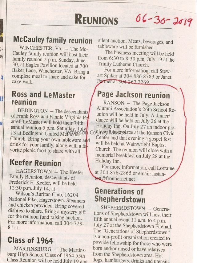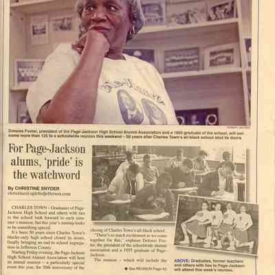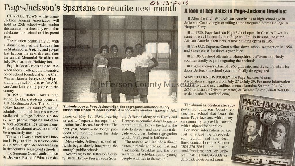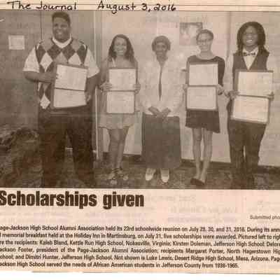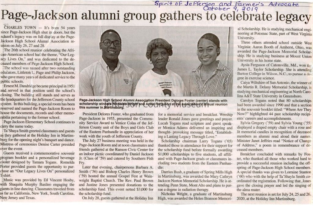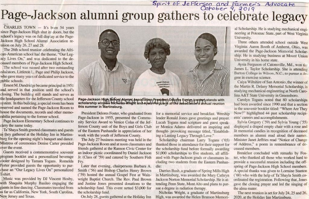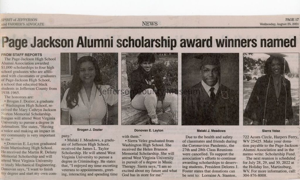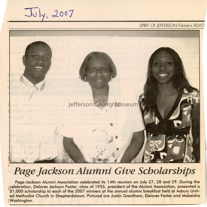 Digital images, bylaws, and newspaper clippings (most from the Spirit of Jefferson and Martinsburg Journal) from Page Jackson Alumni Association reunions and their annual scholarship program.Acquisition