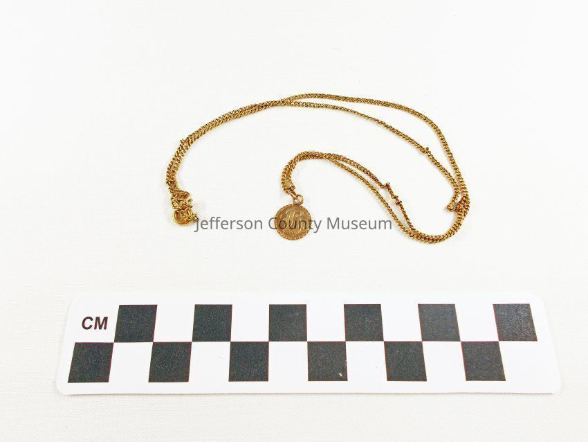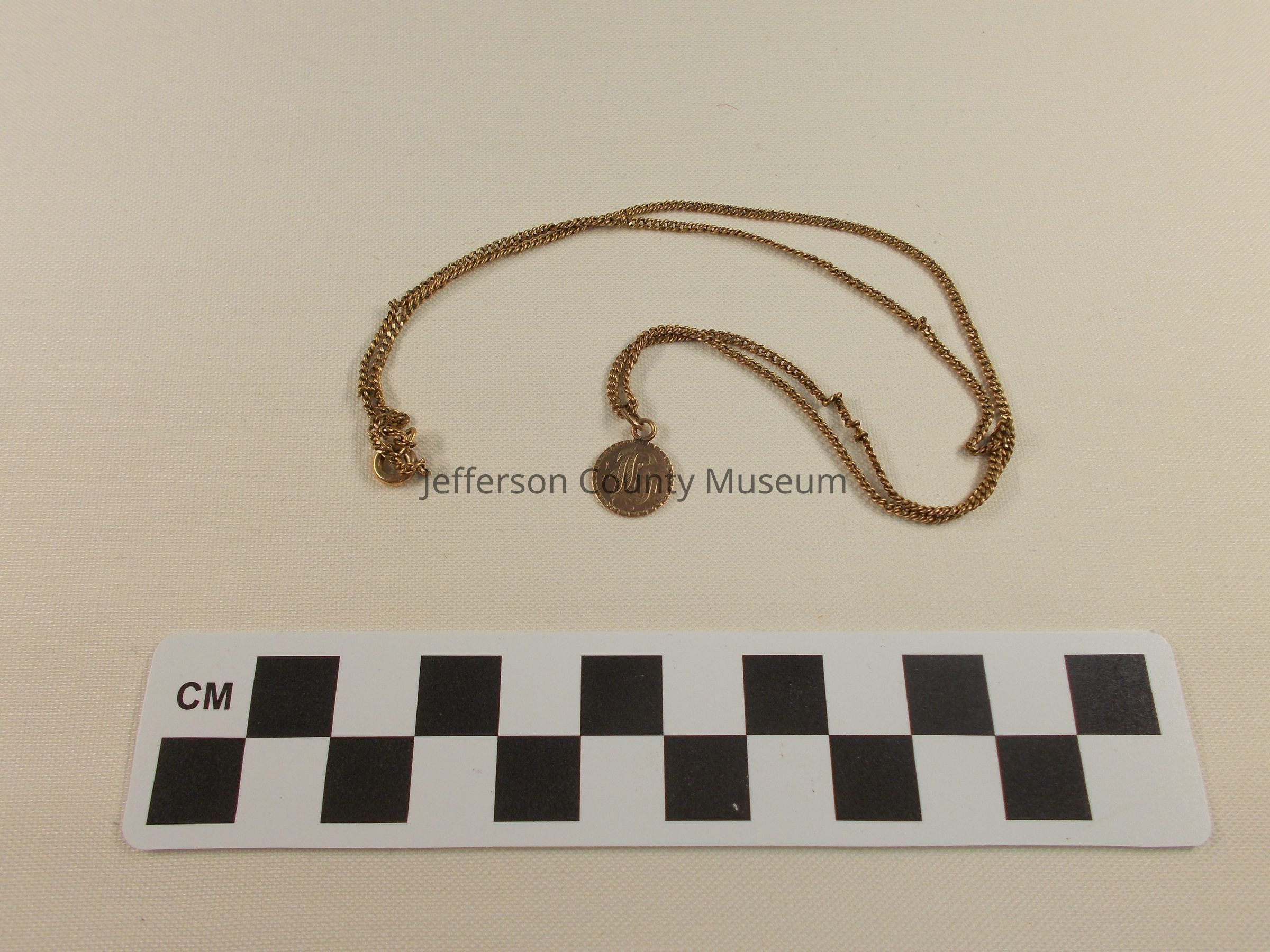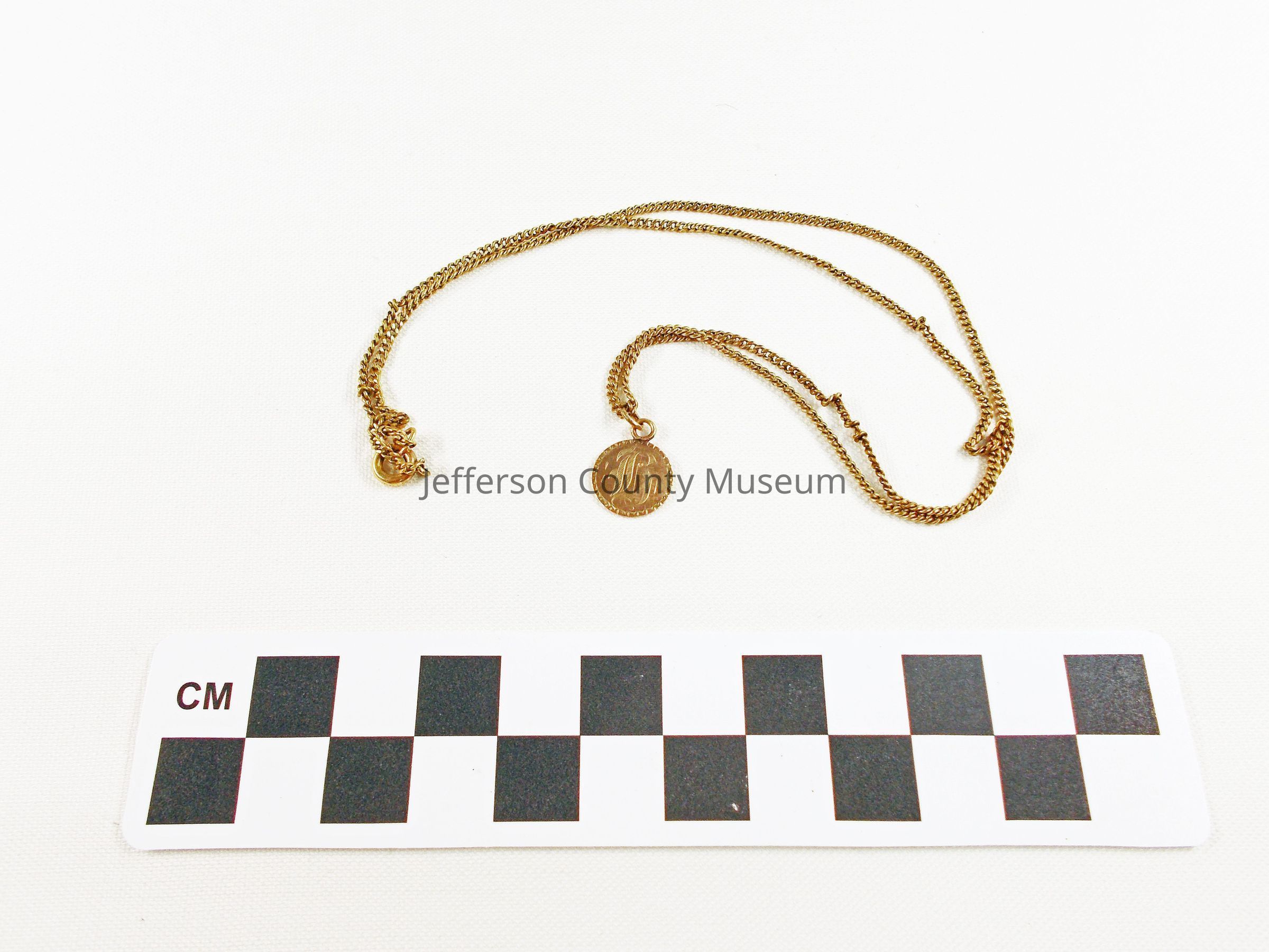 Pendant made from gold nugget, a souvenir of the gold rush of 1849. Has "H" on one side and "1849 on the other. Hangs on gold chain.Context
