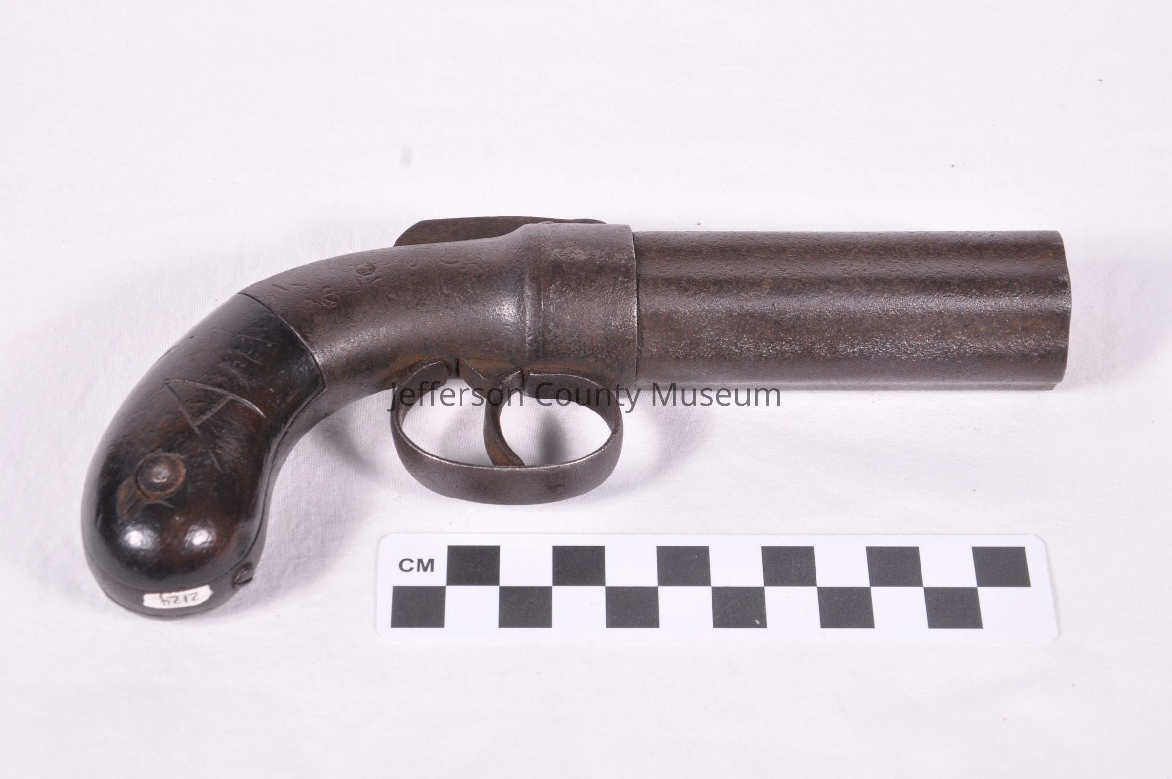 Pepperbox pistol. Six barrels. Marked on recessed hammer: MANHATTAN ARMS CO NEW YORK. Very worn engraving on frame; letter "A" carved on butt.Acquisition