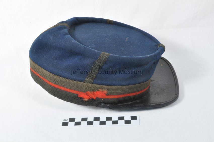 Post Civil War U.S. artillery officer's kepi. Top part of hat is blue wool. Brown or black ribbon sewn to front, back and sides of the blue wool. Two dark brown or faded black ribbons are sewn around bottom part of cap with a small red ribbon between. Bill is hard, black leather. Inside cap is "BROWNING KING & CO. UNIFORMS. 408-410-412 BROOME ST. NEW YORK." Partially torn round paper sticker says "7 1/2".Acquisition
