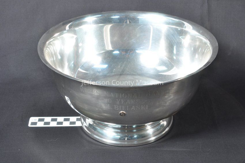 Presentation bowl. Inscribed "RIGGS NATIONAL BANK 40 YEARS J. M. BIELASKI". Below that is small eagle logo with shield and "RIGGS". On bottom 34 STERLING - PAUL REVERE BOWL-REPRODUCTION BY WEB".Acquisition