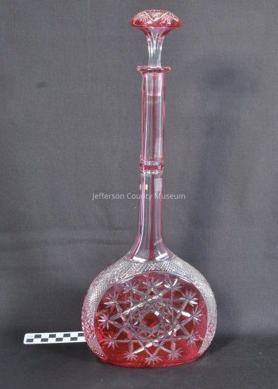 Press-cut long necked decanter with glass stopper. Clear glass with red flashing.Acquisition