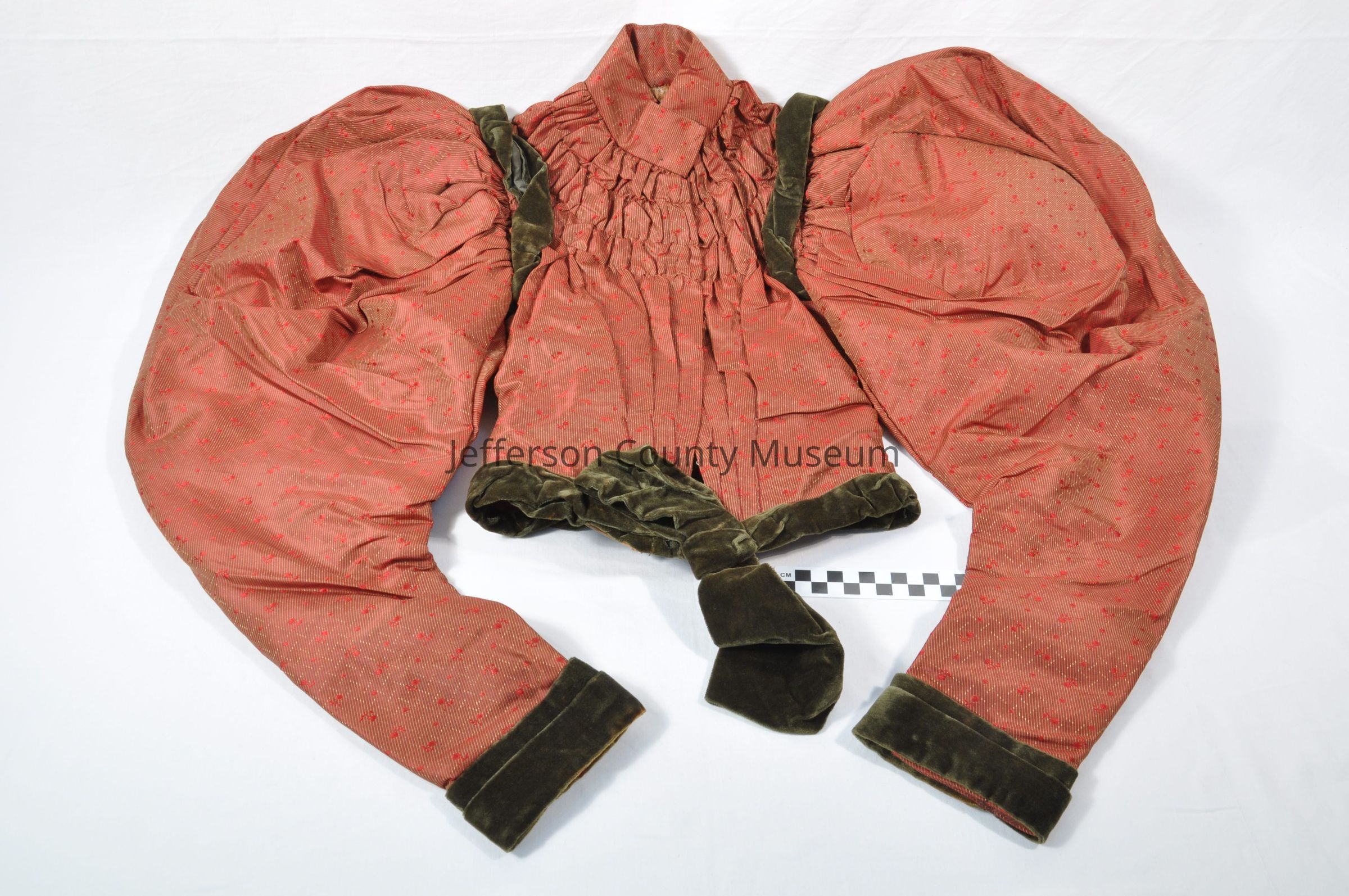 Red silk, lined and with bone stays at waist. Puffed leg-o-mutton sleeves. Velvet trim at end of sleeves, at waist and shoulders. High collar, gathered around top and pleats running from gathers to waist in front. Hook and eye closures.Acquisition