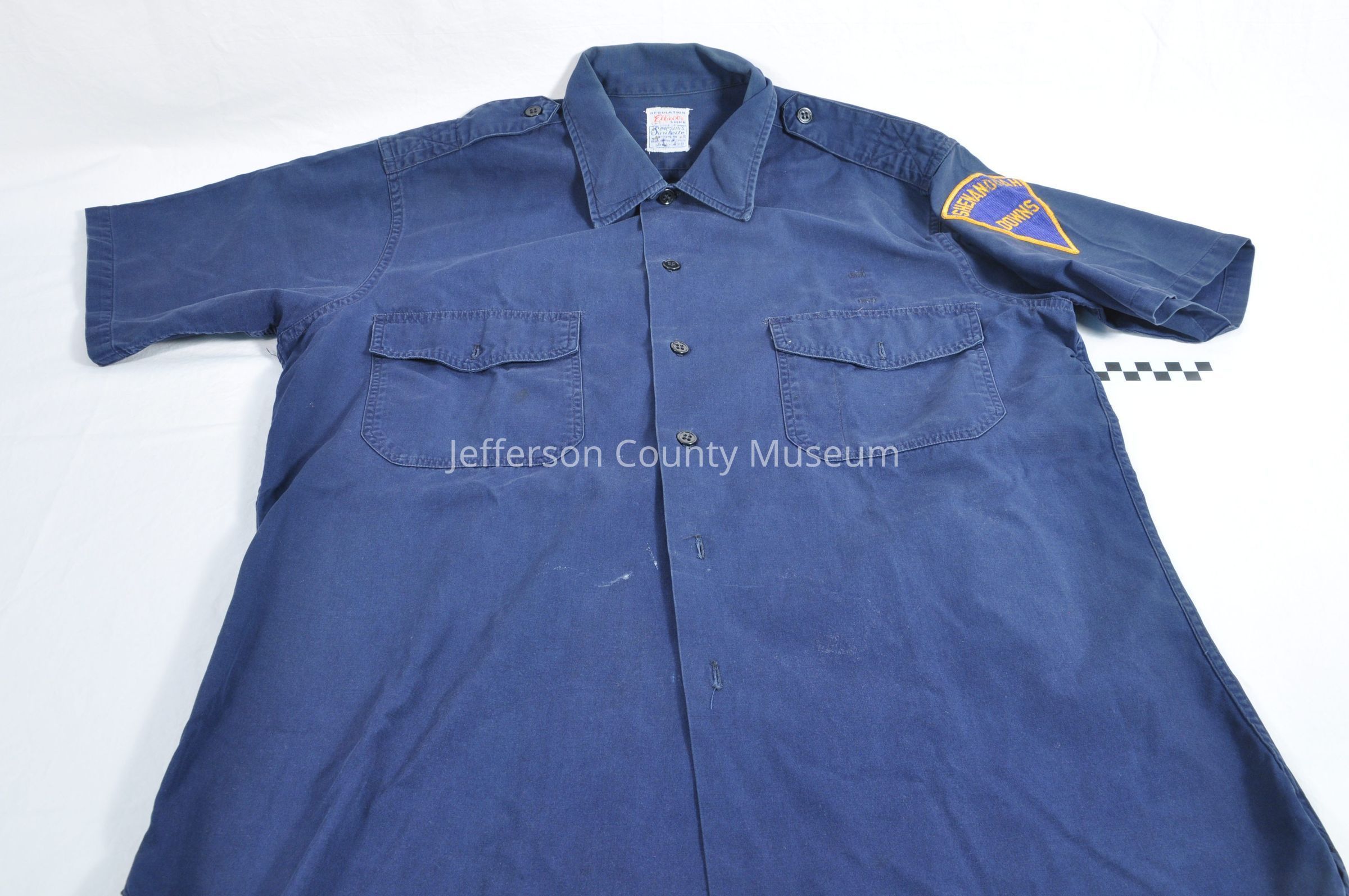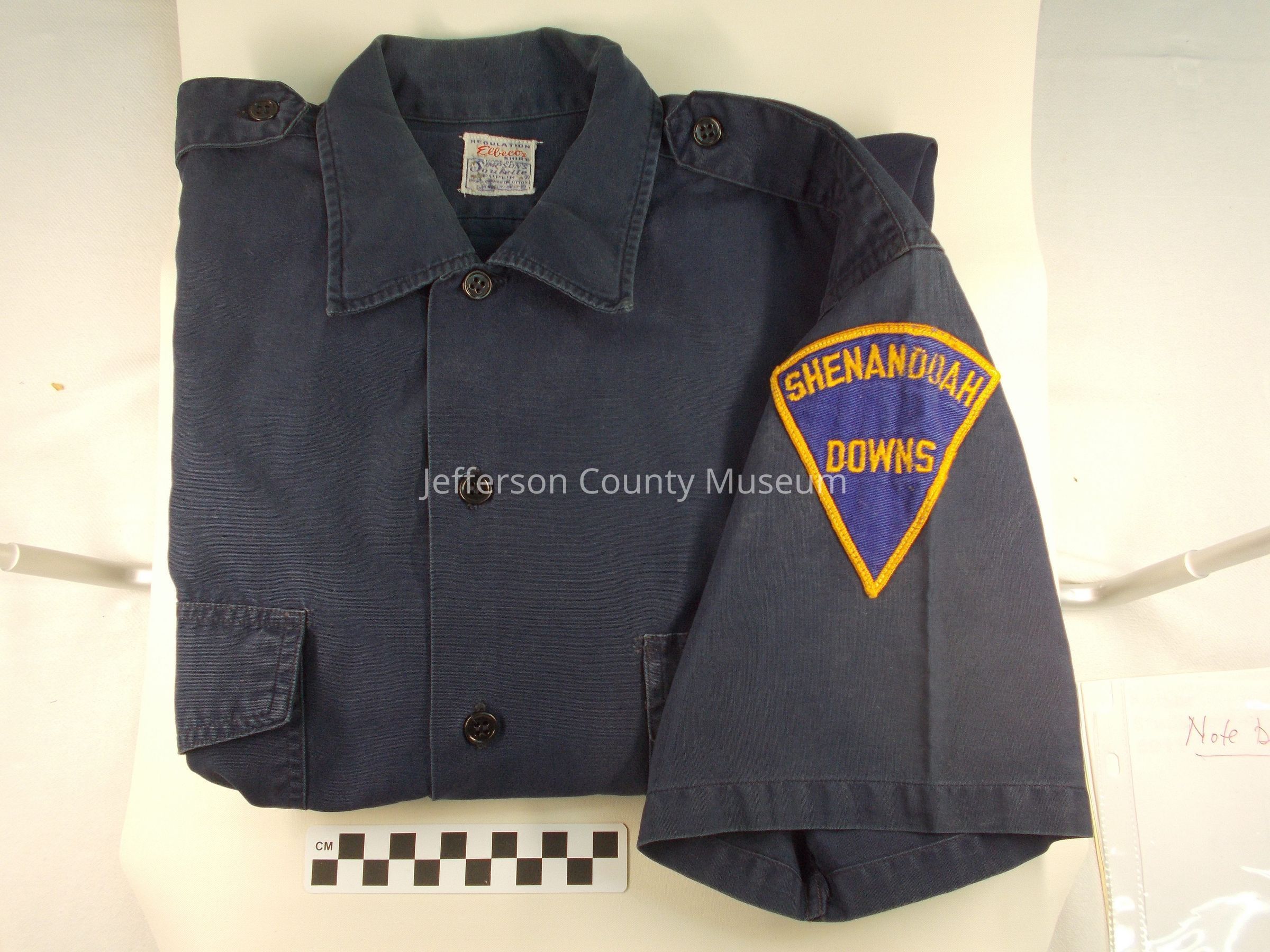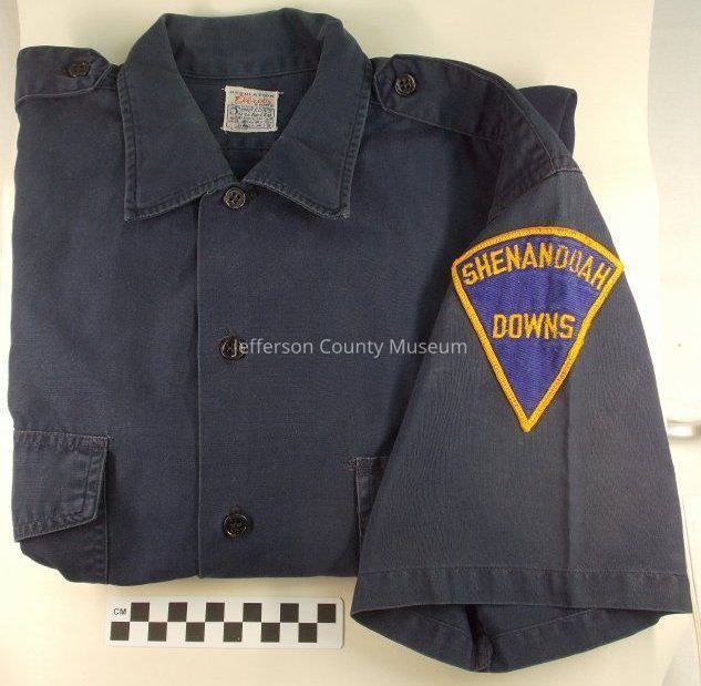 Shirt worn by a guard at Shenandoah Downs racetrack (race track) in Charles Town. Short-sleeved dark blue shirt with a breast pocket on either side. Five black four-holed buttons and six buttonholes down the front of the shirt (one button missing). Each pocket with a flap that buttons with a four-hole black button to the upper part of the pocket. Black-buttoned epaulet on each shoulder. Above left pocket on inside is a loop, perhaps to hold a badge. Patch on left sleeve with blue background on which "Shenandoah Downs" is embroidered in gold thread and with gold thread embroidered around the edges of the patch. Patch is shaped like a 60-degree segment of a circle, with two straight sides from center (at bottom of patch) to an arc which forms the top of the patch.Acquisition