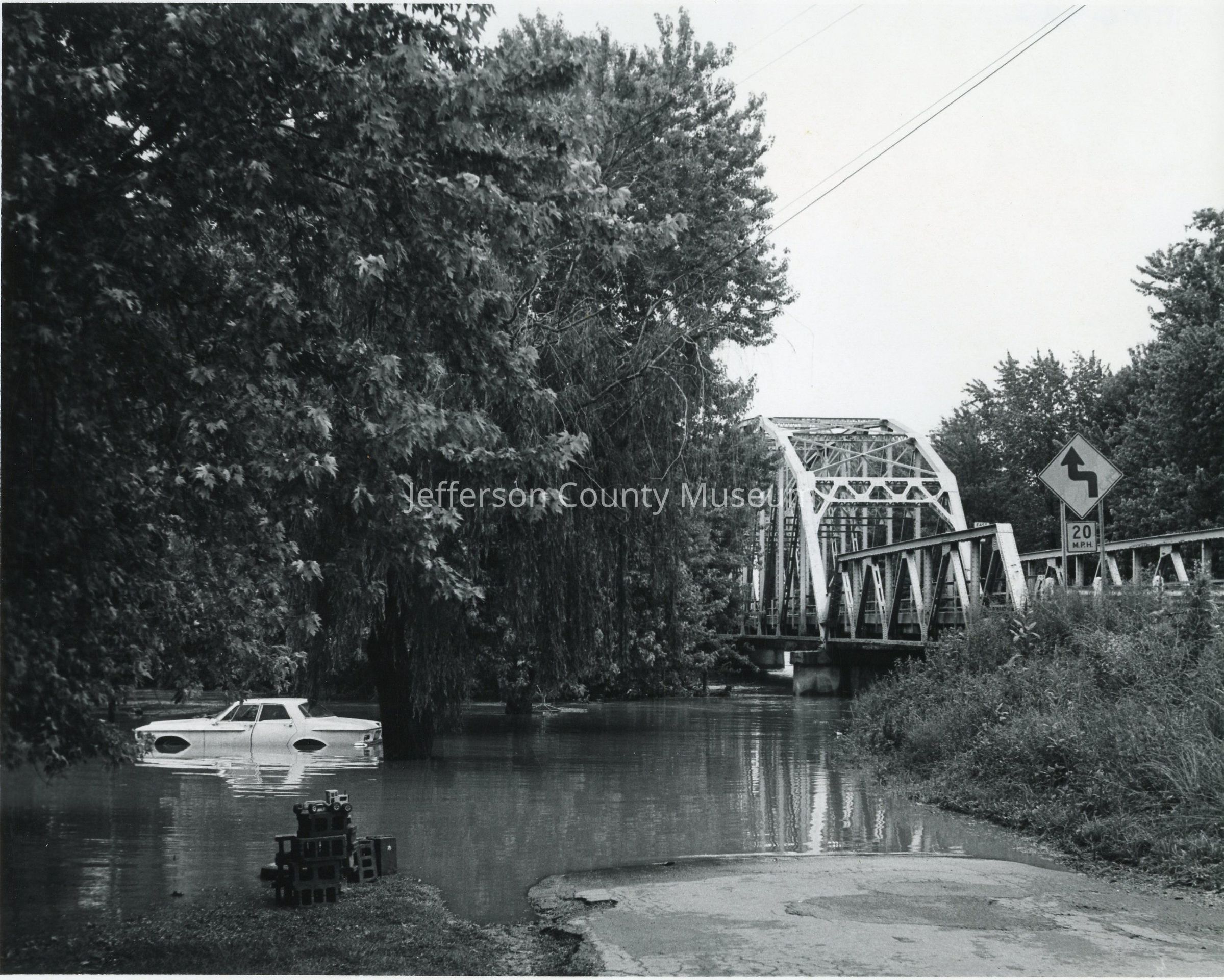 Shenandoah River flood near the Bloomery in June 1972 in the aftermath of Hurricane Agnes. The Bloomery Bridge which carried Route 9 across the Shenandoah River is in the background. The Bloomery Bridge, built in the 1930s, was replaced by the present-day Dailey Bridge in September 1990.