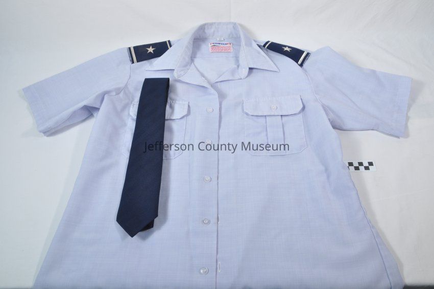 Short-sleeved, light blue, U.S. Air Force uniform shirt. Could be worn with dress blue uniform (object #274). Button front. Two button-down pockets on front. Dark blue epaulets with thin silver stripe on each end and silver star of brigadier general. Small white label inside below collar in black numbers "16 1/2". Label sewn in below that "PROPPER THE BRAND THAT'S BATTLE TESTED". Label sewn in below that has care instructions in red letters. Label sewn on bottom left front has description and care instructions. A dark blue necktie goes with the shirt; this tie is appropriate to wear, without the jacket (though both this tie and the tie cataloged with #274 could be worn with the dress blues uniform). On the narrow end of the tie is the number "01". 327a: tie, 327b: shirtAcquisition