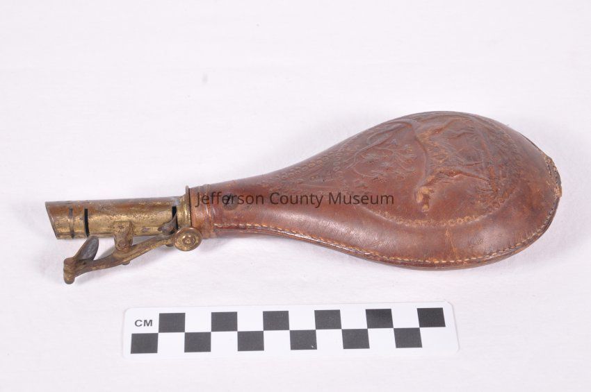 Brass spout and leather pouch for shot. Measuring spout marked "1 1/2, 1 1/4 AM. FLASK & CAP CO". Leather pouch made with top stitching. Hunting hound design with overhanging tree and rail fence in background on both sides. "3 lbs" stamped into one side. Filled with lead shot.Acquisition