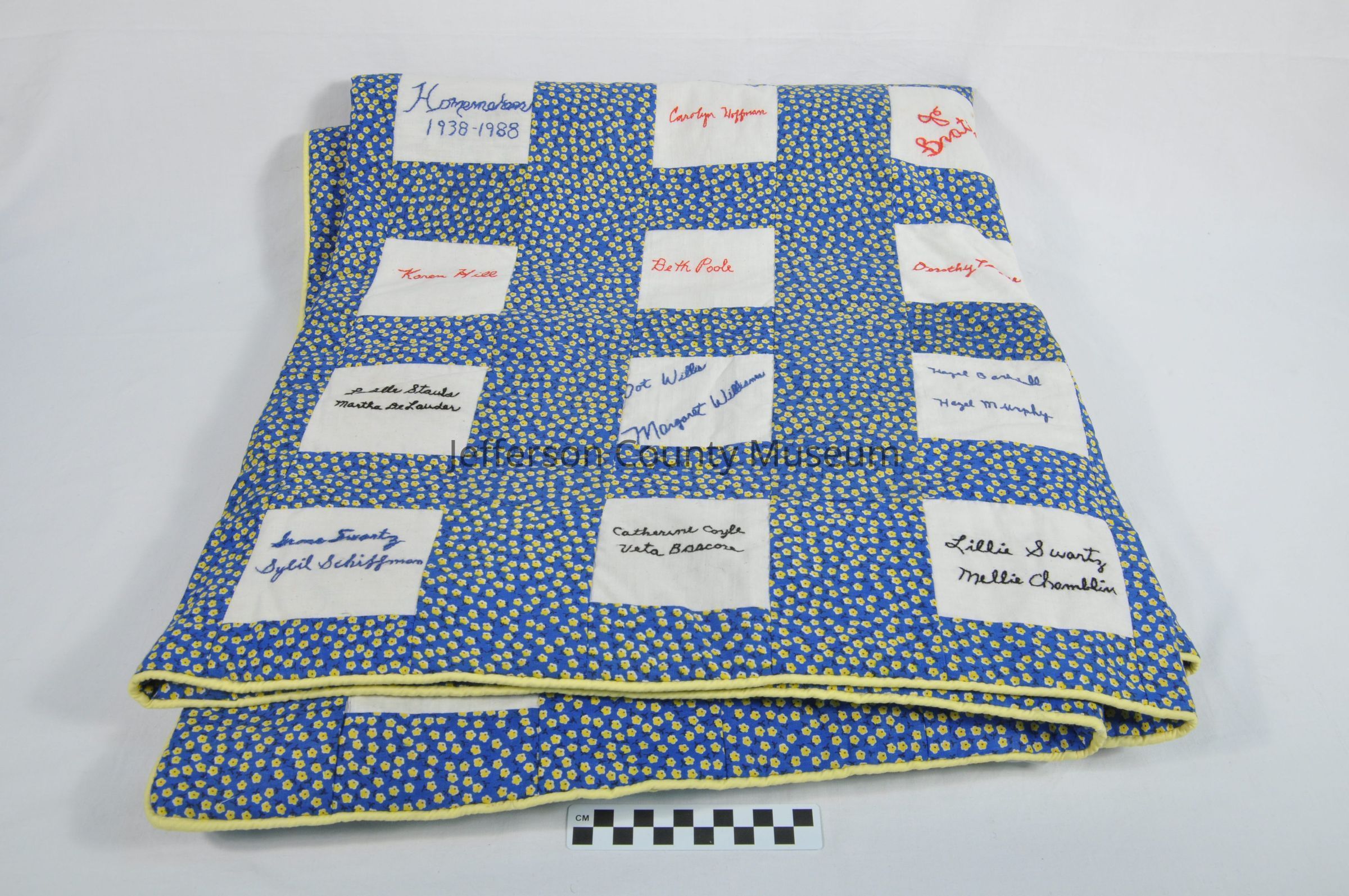 Signature quilt with 120 names. Background is small yellow flowers on blue background. There are 72 white blocks. All but two have names. Some blocks have two names. One block has "Leetown", the one to right has "Extension" and the next "Homemakers 1938-1988".Acquisition