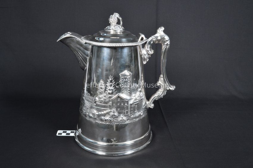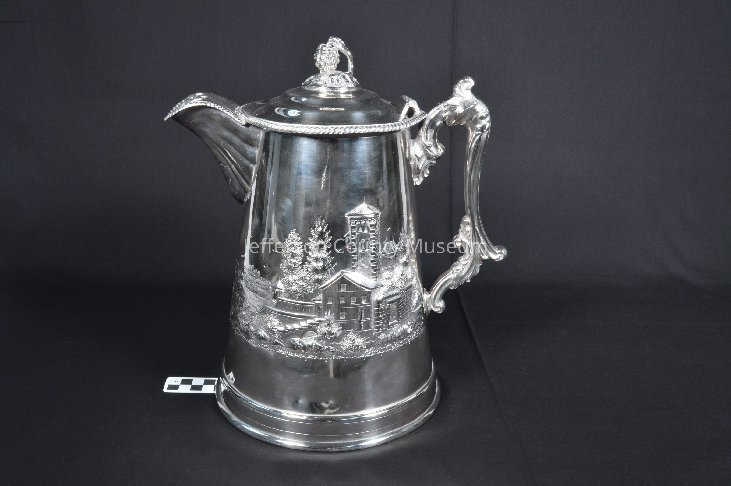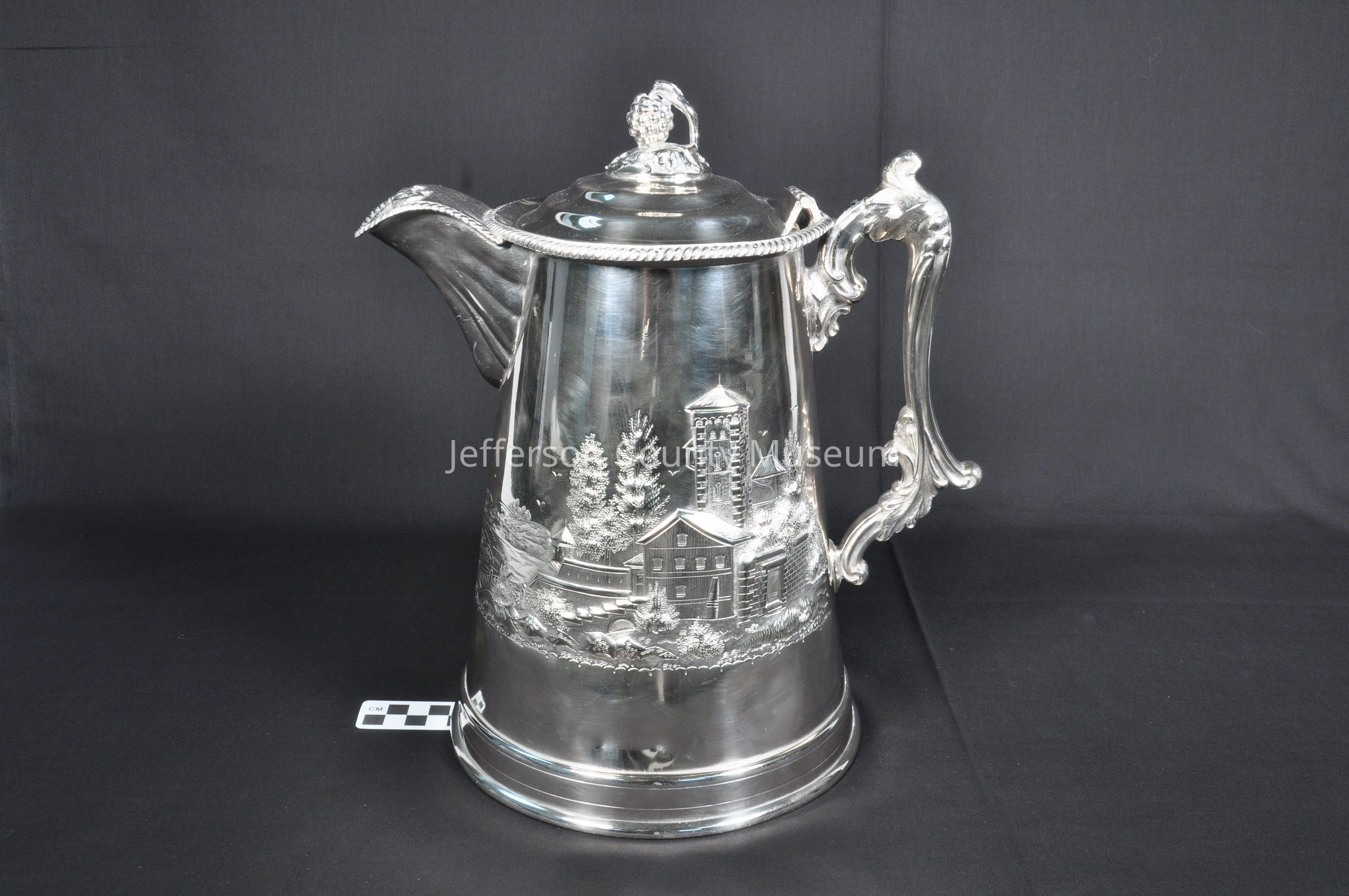 Silver water pitcher showing a house, tower, trees, and birds on one side, sailing ship on the other side. Hinged lid with grape cluster finial. Inscribed on the pitcher is "MERIDEN BRIT'A Co. DOUBLE WALL PITCHER LYMAN'S PATENT JUNE 8, 1858". A Spirit of Jefferson County clipping from February 8, 1933, to Mrs. Humphrey Keyes mentions(?) the pitcher. See also "When Tidewater Invaded the Valley". Also there is a letter (ARC675 K16) from the Richmond Grays to Mrs. Jane H. Keyes written on December 22, 1859, that accompanied the pitcher and goblets catalog numbers 127 and 128.Acquisition