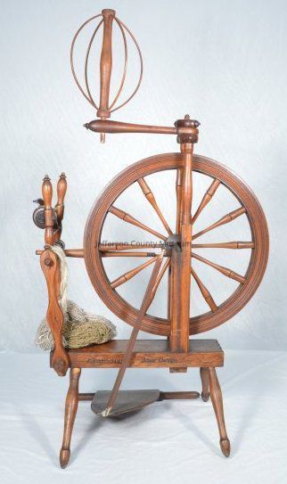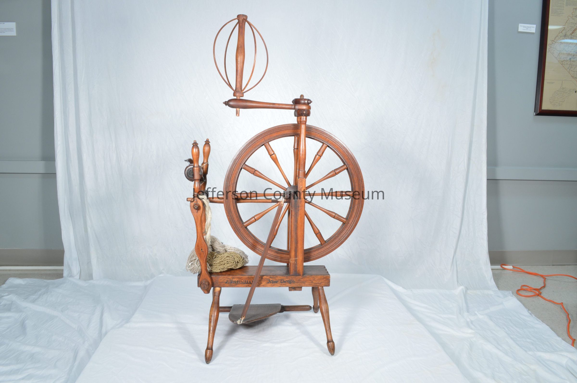 Small flax spinning wheel, four legs that are removable. Thread holder is wound with coarse thread.