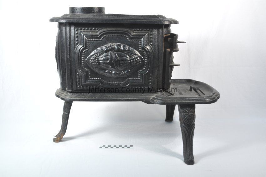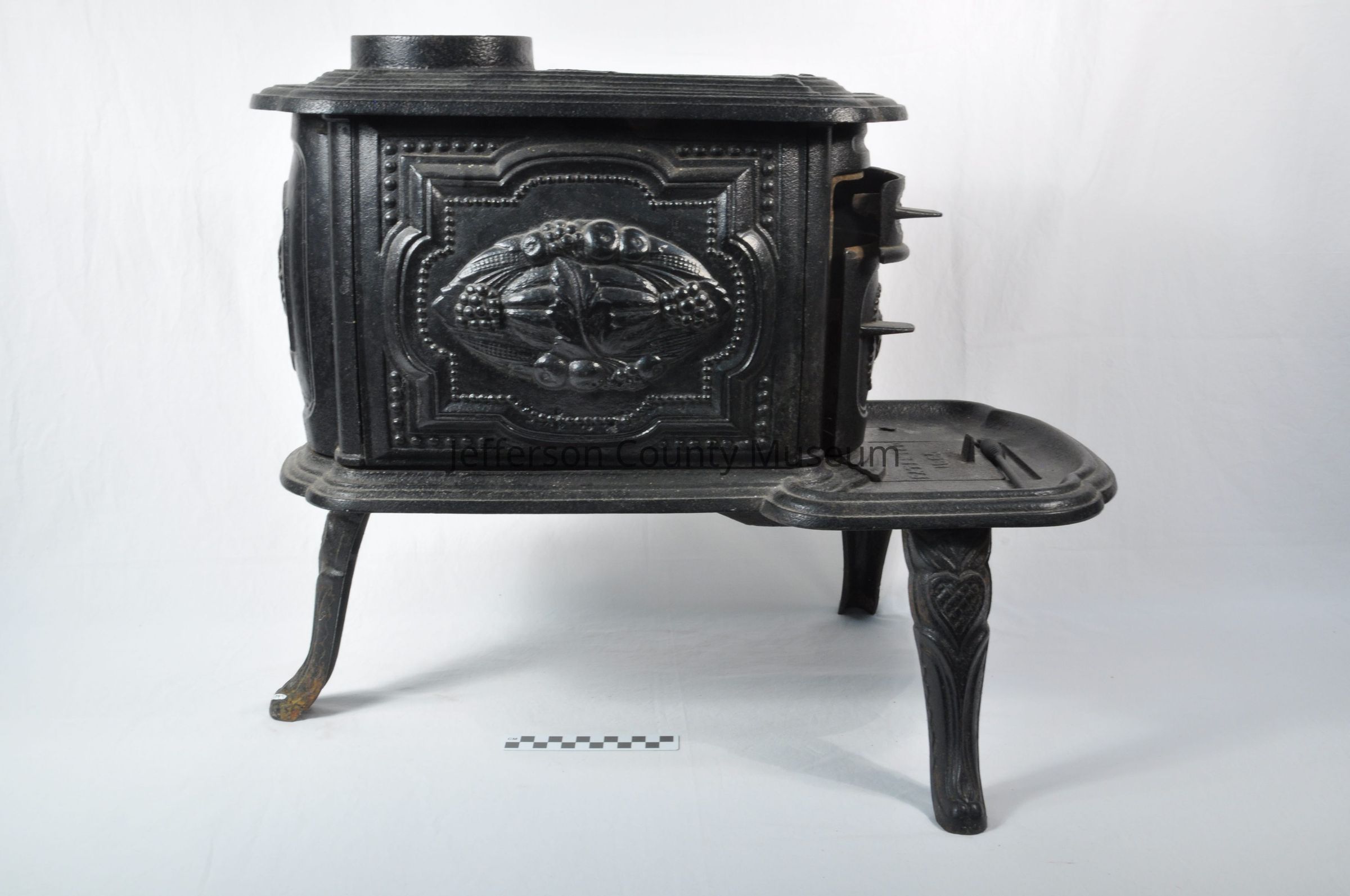 Small three legged cast iron parlor stove with fruit and foliage design on sides. Two doors on front, a small one at top for draft and a larger one for inserting wood. Round lid on top of stove. Small flat removable draft plate on tray on front. Embossed on this plate is "PATENTED 1865". On top around lid is "ISAAC A. SHEPPARD & CO. BALTIMORE MD. 16". Embossed on small draft door "WOODLAND". A small poker is on the tray in front.Acquisition