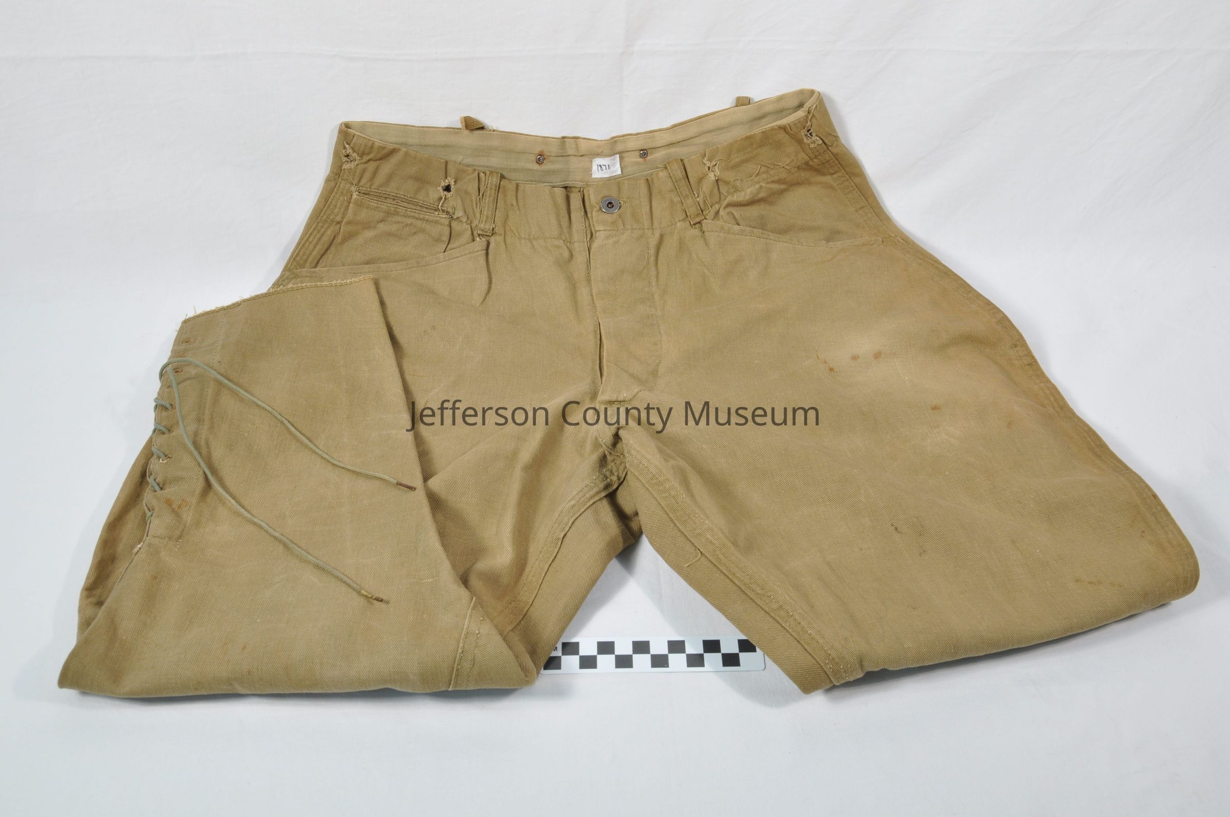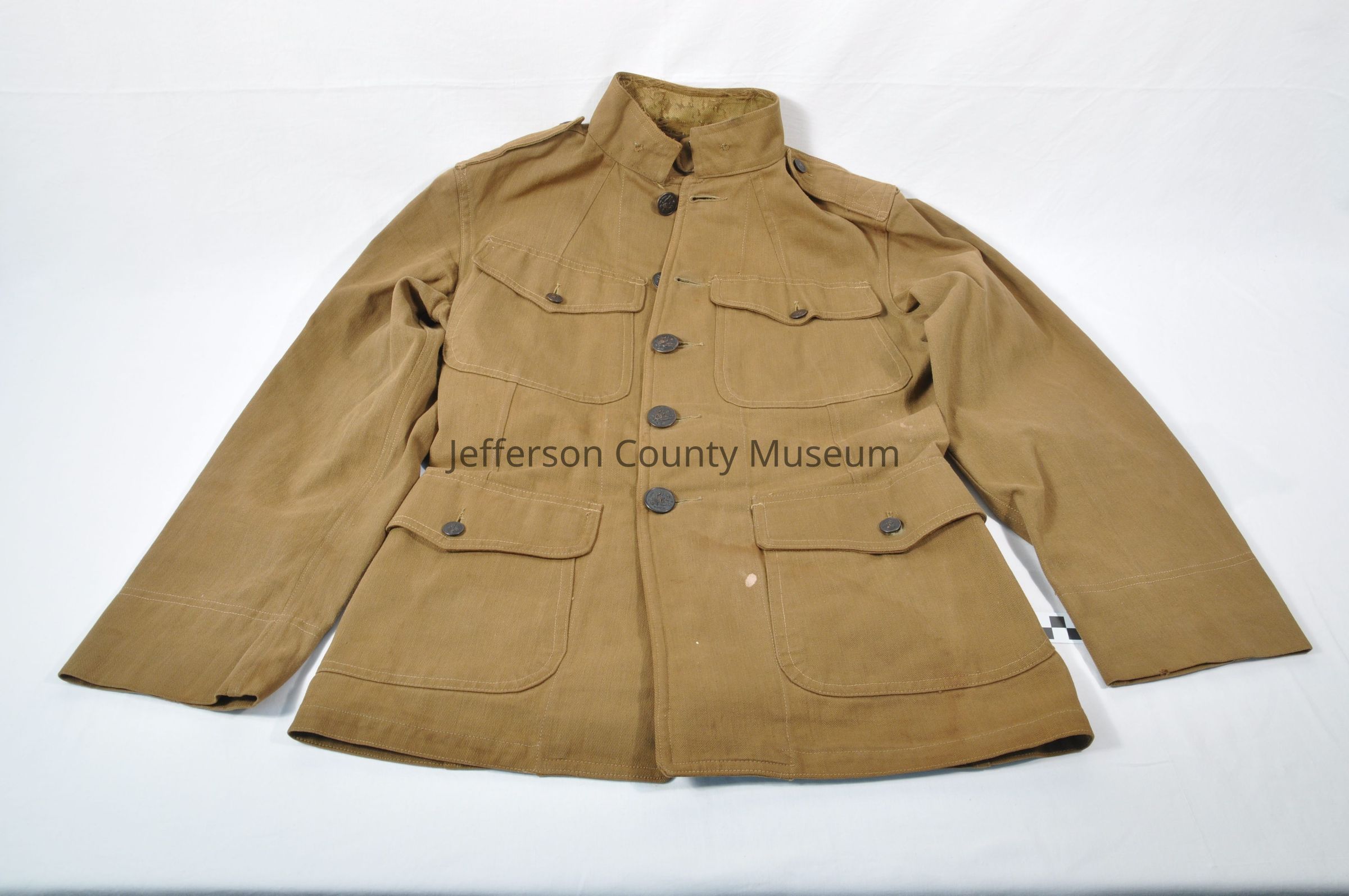Spanish-American War era uniform with tunic and trousers. Tunic has five eagle buttons down front and buttons on four pockets as well as two buttons holding the epaulets in place. There are two hook and eye closures on the hight collar. There are what may be sergeant's stripes on the right sleeve. The trousers were made for riding a horse with reinforced seat and narrowed legs for riding boots. The bottom of the legs have laces with nine lace holes. The pants were made for suspenders and also has belt loops.Acquisition