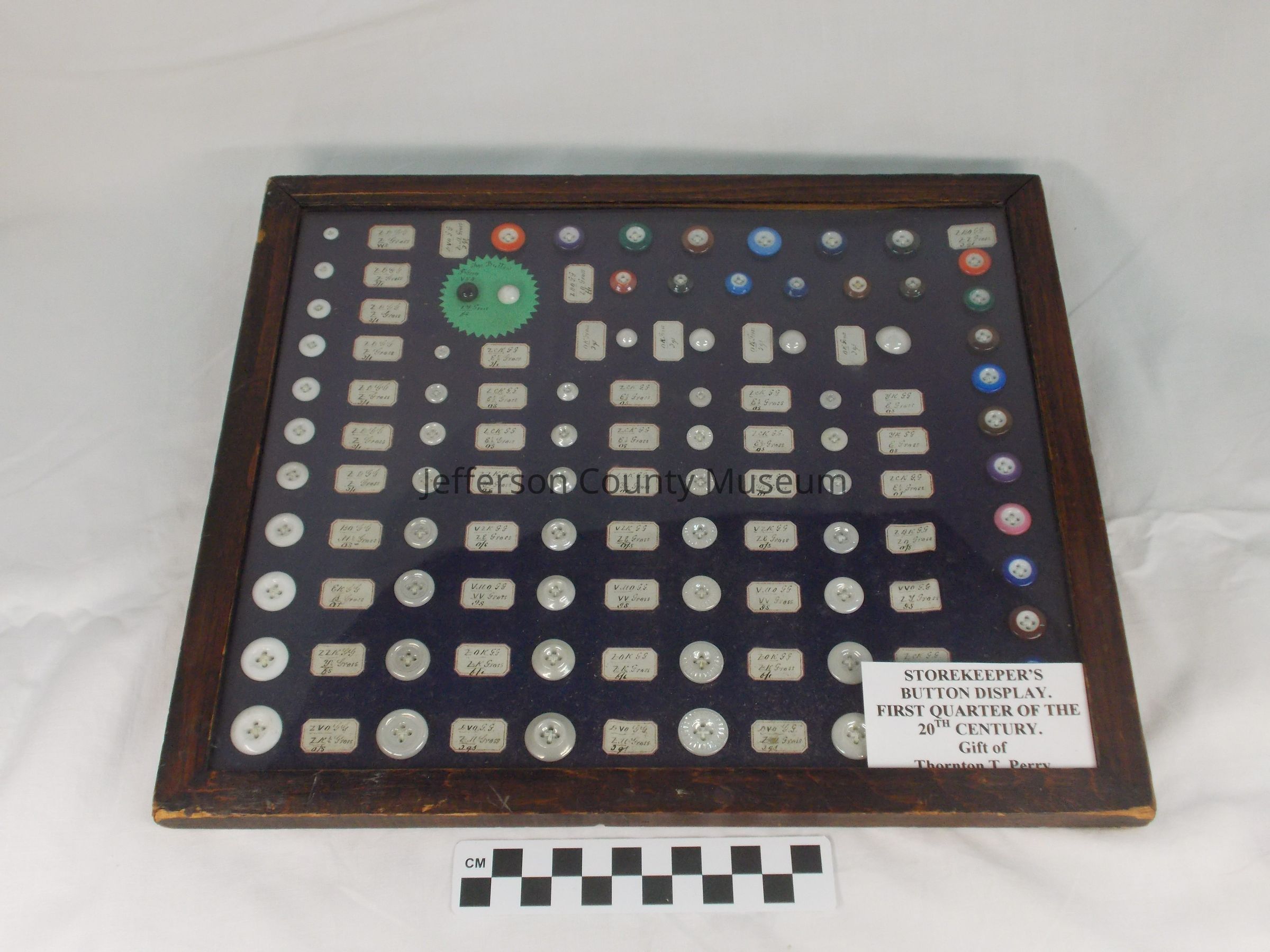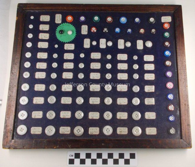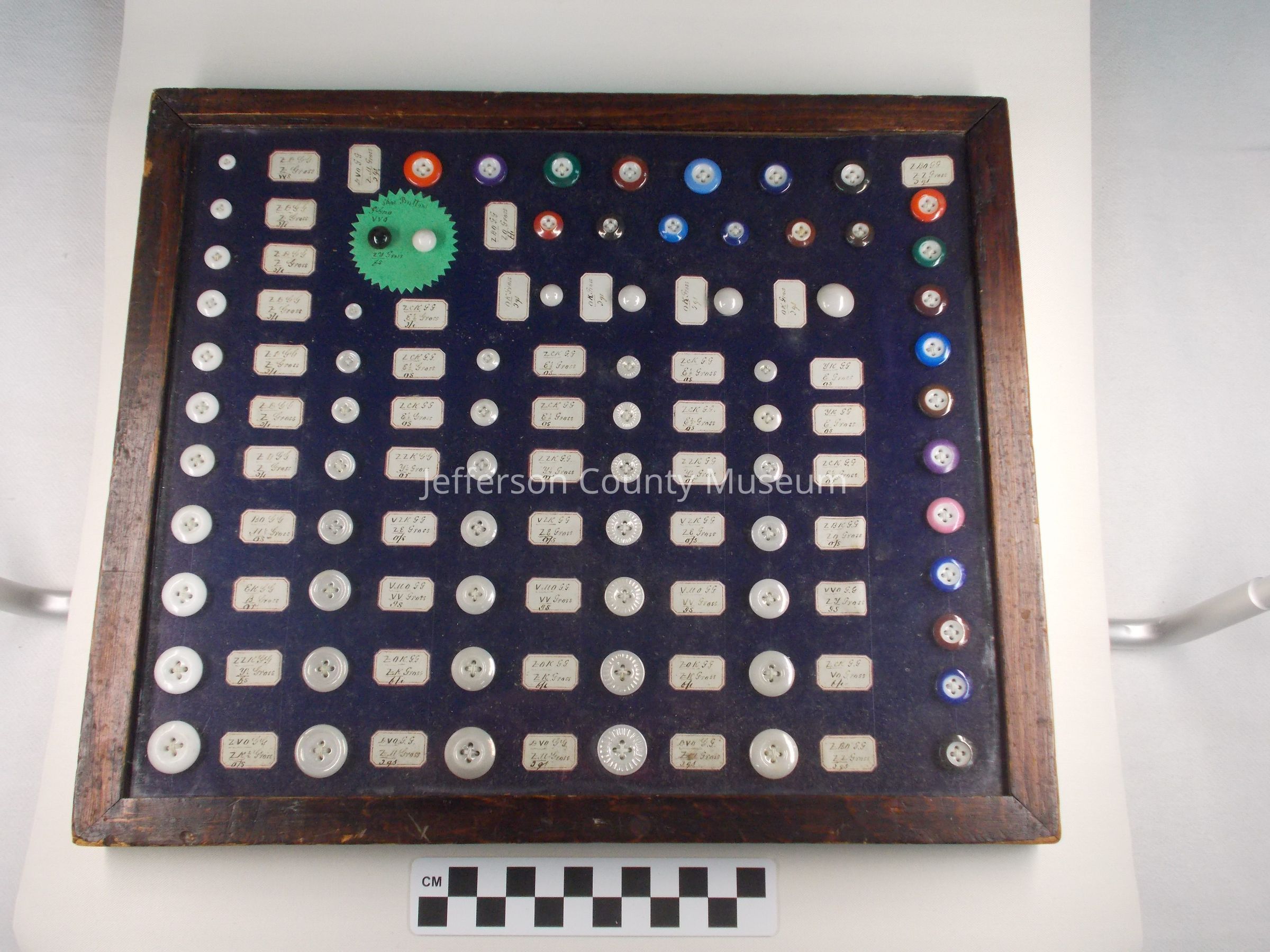 Storekeeper's button display in wood frame with glass front. Circa 1900. There are 70 buttons of 8 different designs. 24 buttons have different colored rims, 45 white buttons and one round black button. Most buttons have a handwritten paper label describing the button.Acquisition