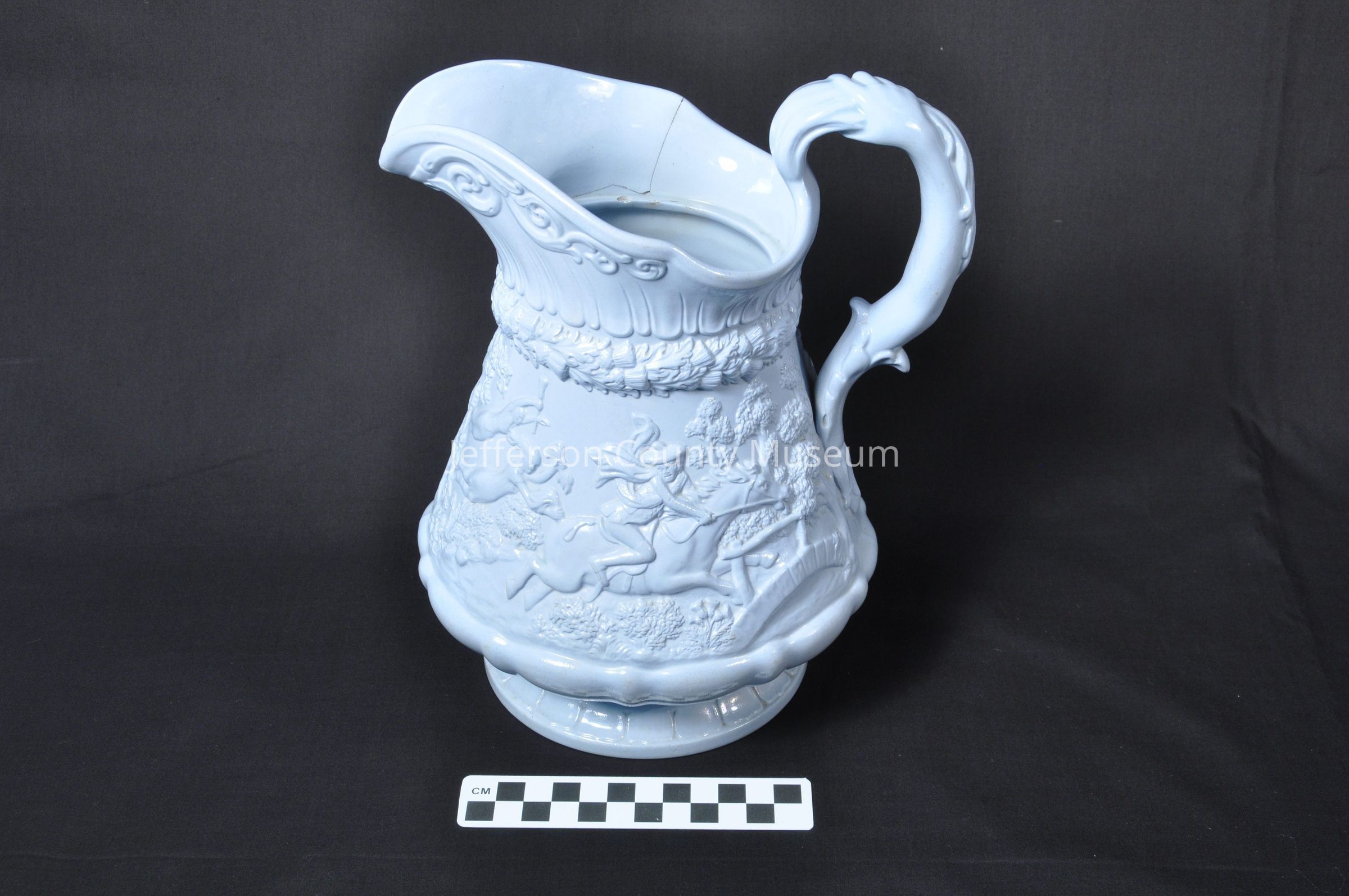 "Tam O'Shanter" blue pitcher. Scene on one side shows man on horse with woman behind holding onto tail of horse. Also woman with broom in one hand seemingly flying. Scene on other side shows men sitting drinking. One man at fireplace lighting a pipe while dog watches.Acquisition
