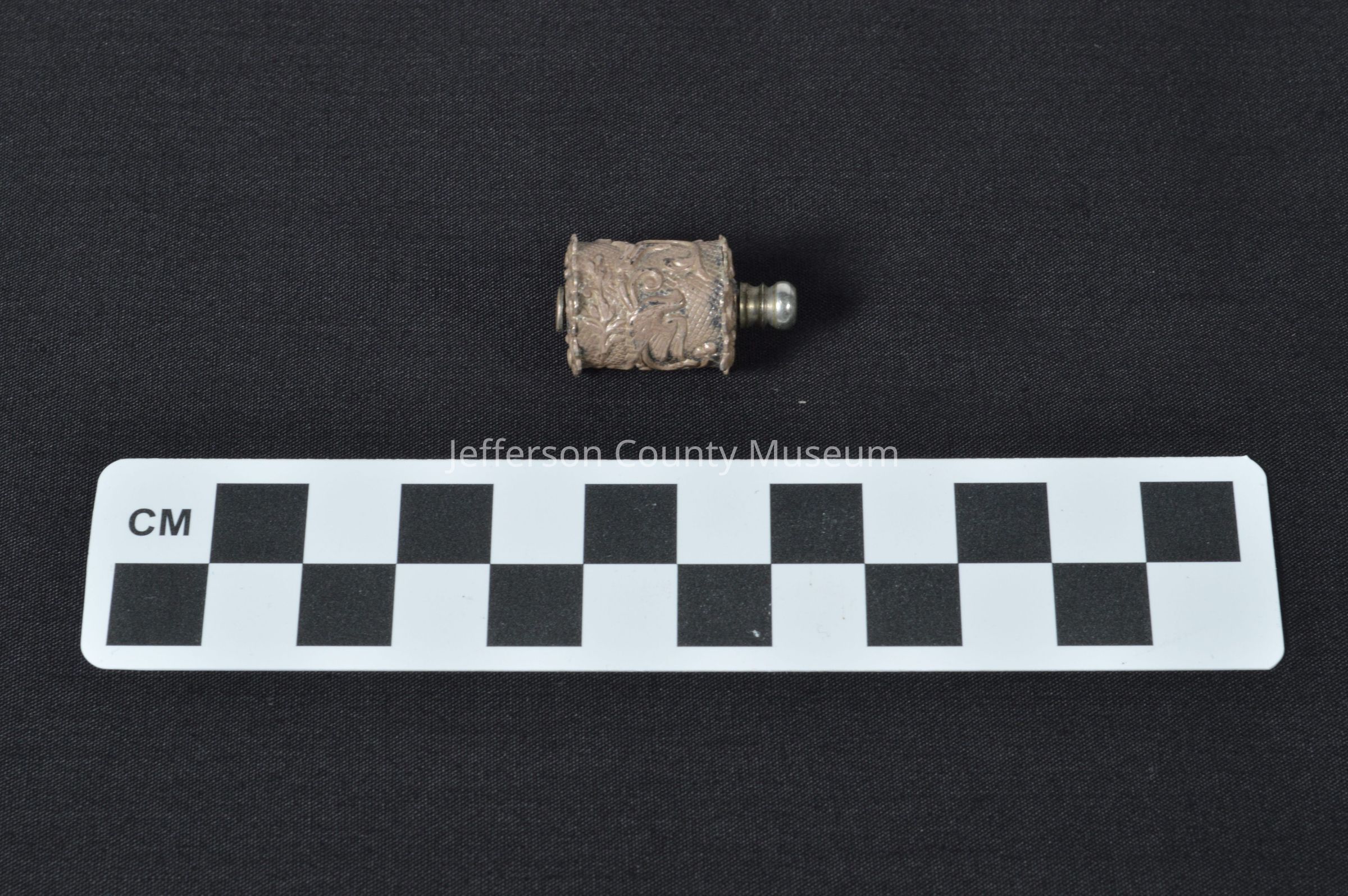 Tape measure in silver colored cylinder with raised bird and flower designEntry/Object ID
