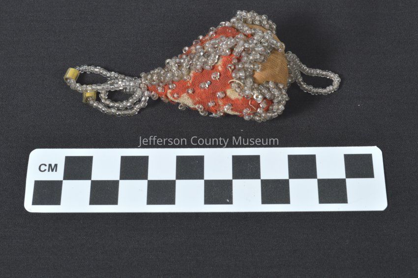 Teardrop shaped pincushion covered with red cloth which is now deteriorating. Clear white beads surround pincushion. One loop of beads at top and 2 loops at bottom.