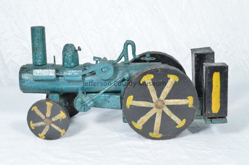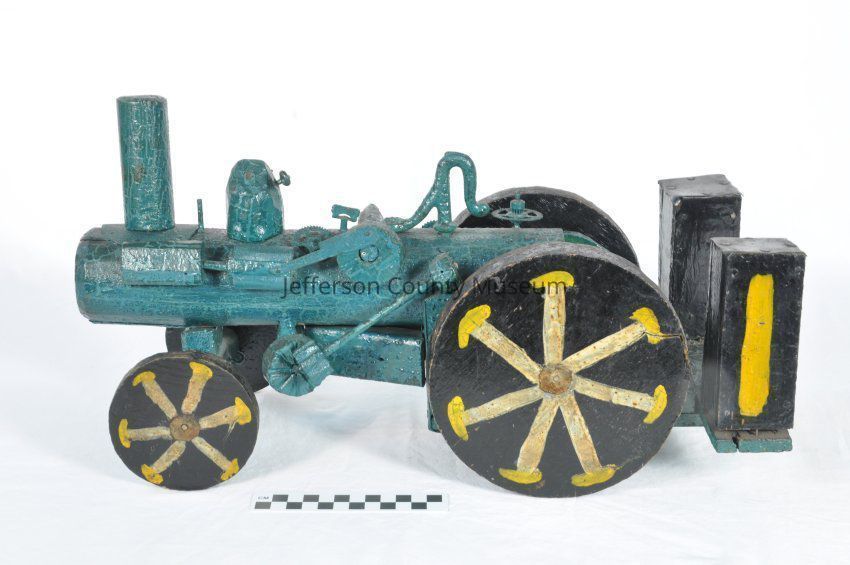 Threshing machine toy, crudely built mostly of wood with some metal parts and pieces. Large rear wheels painted black with yellow spokes, smaller front wheels. Machine is painted green overall except wheels and an attachment on back with two square black vertical pieces.Acquisition