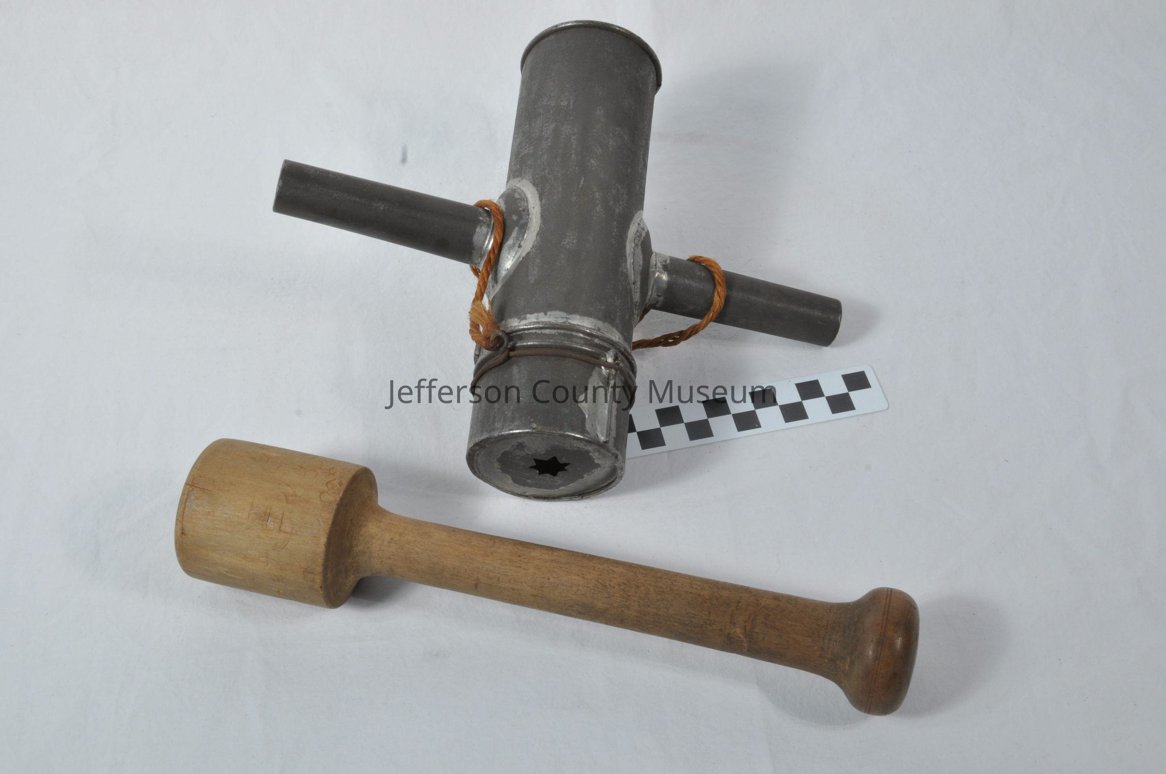 Tin cylindrical press with lid on one end with seven pointed star hole for making cookies. There are two tin handles soldered to each side of the cylinder. A wooden plunger shaped like a mallet fits into the cylinder.Acquisition