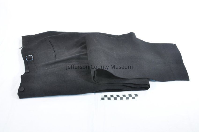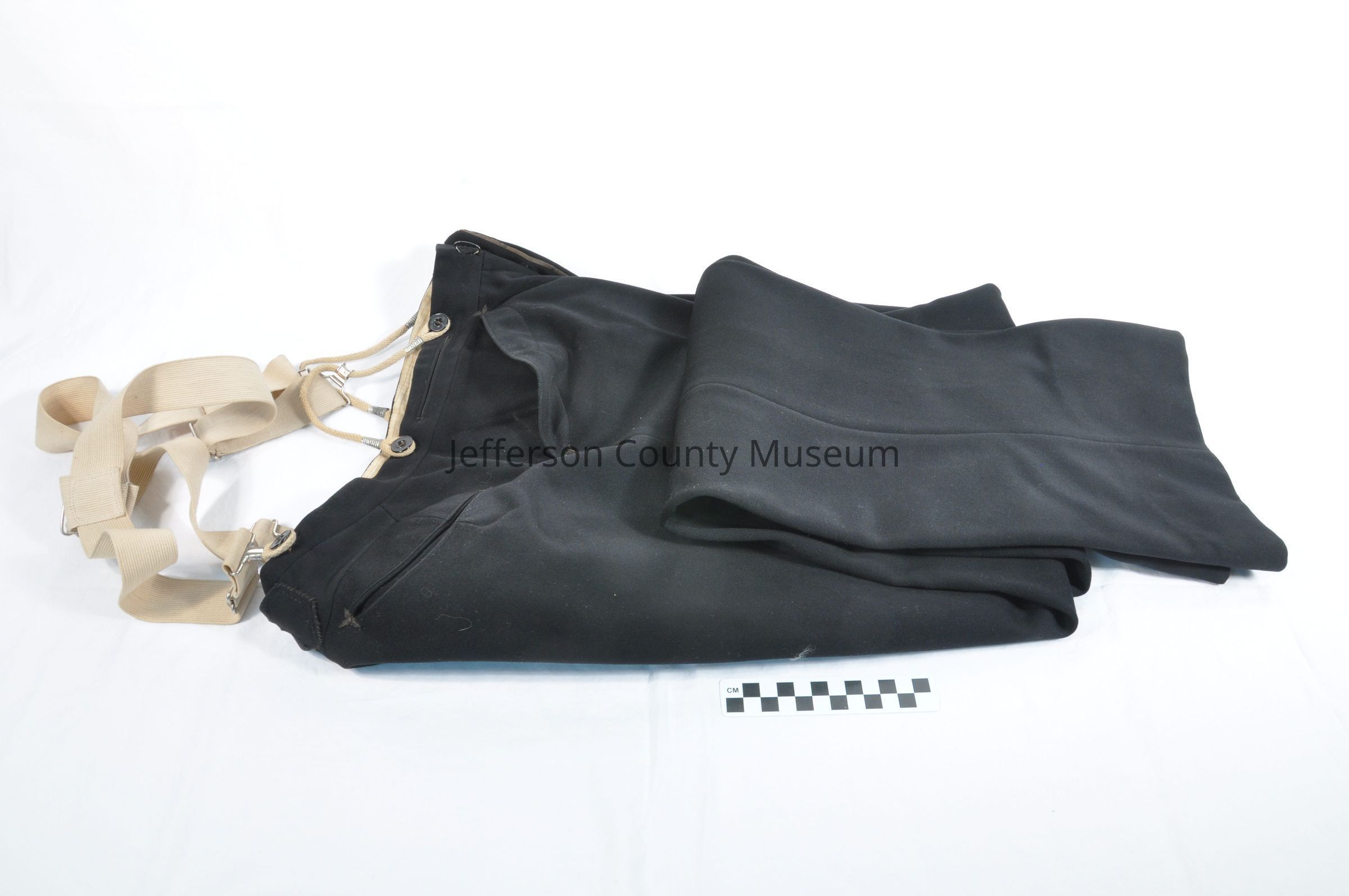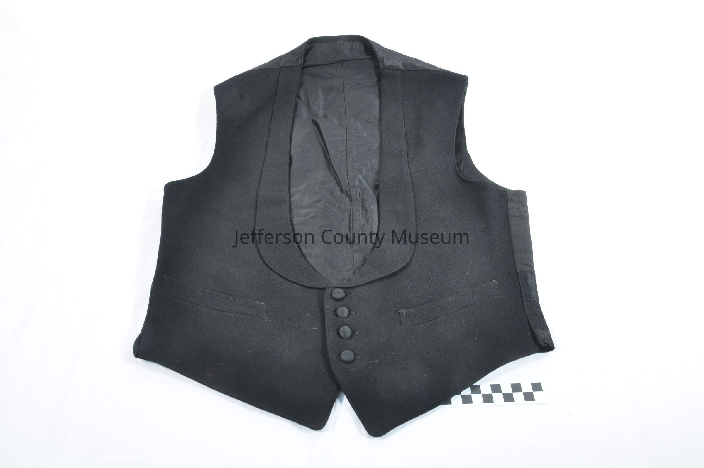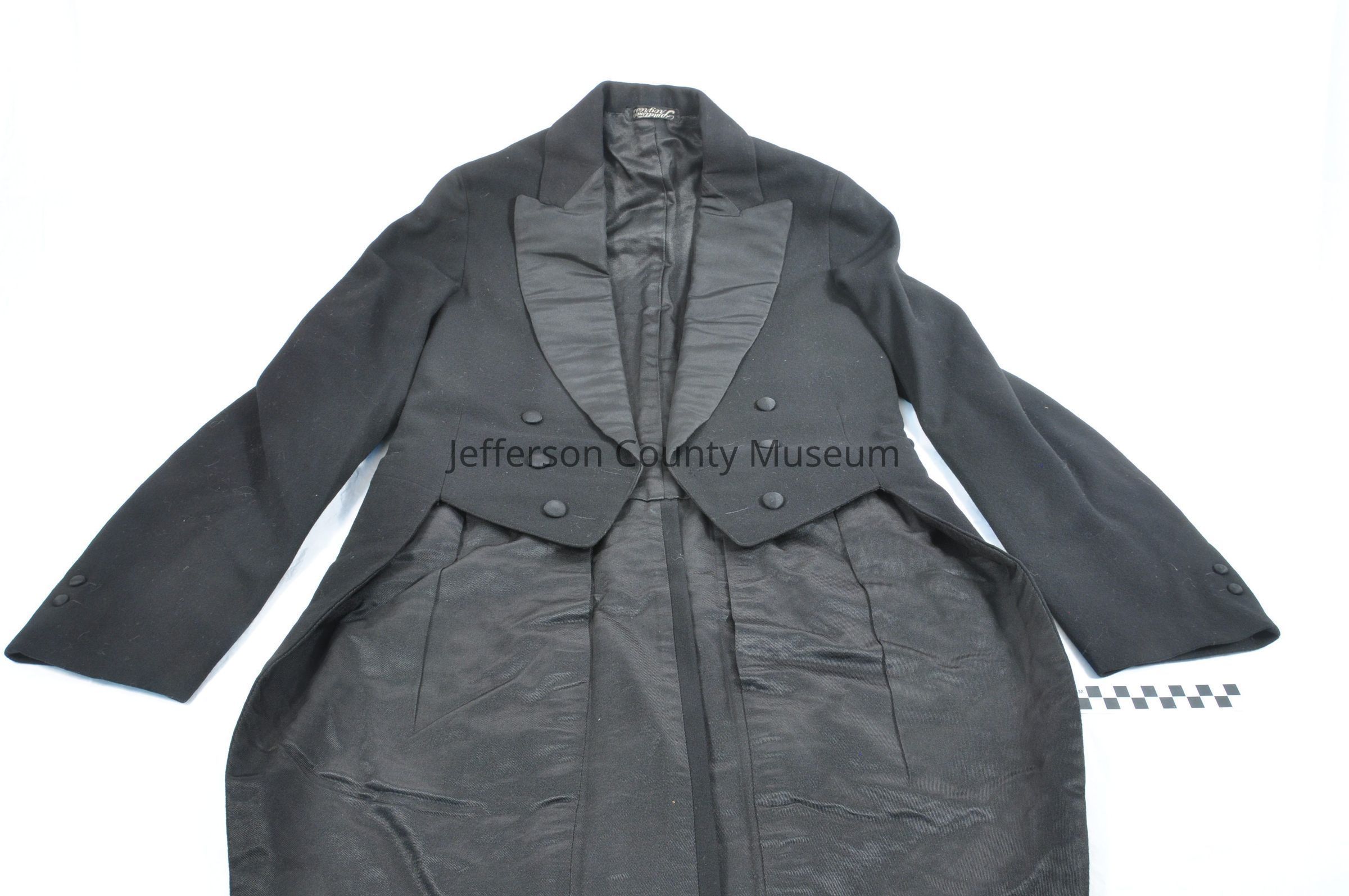 Tuxedo with jacket with tails (1854a), one pair of pants with white suspenders (91854b), one pair of pants (1854c), and a vest 91854d). The jacket has satin lapels and six satin buttons on front. Also has two satin buttons on each cuff and two satin buttons in back. Label on collar says "Meltsner's Progress". Pants with suspenders has small metal buckle in back. Pants without suspenders has buckle on each side of waist and five satin buttons for suspenders. One button is missing. The vest has four satin buttons, two pockets and a buckle in back.Acquisition