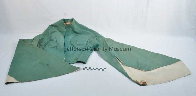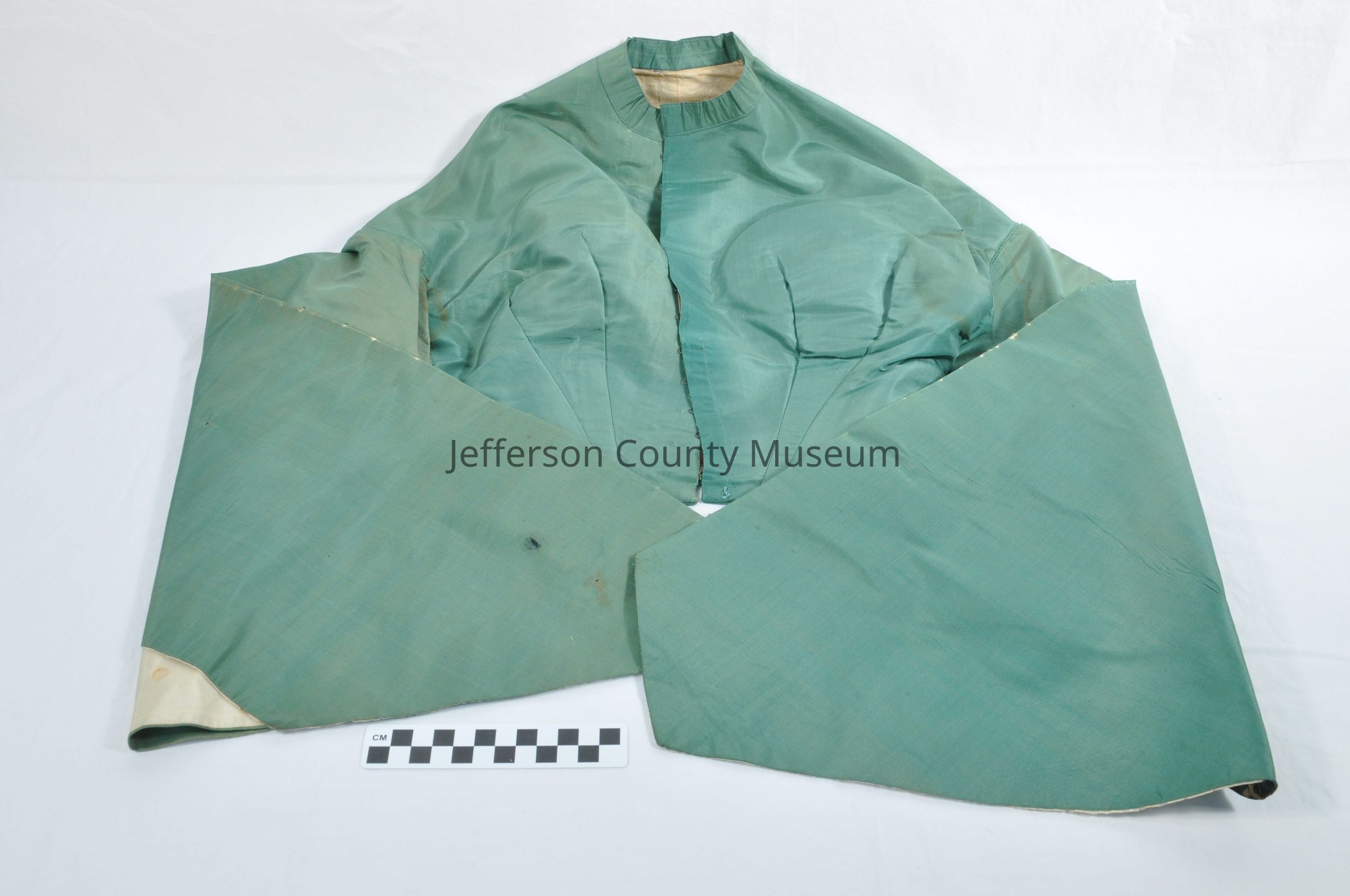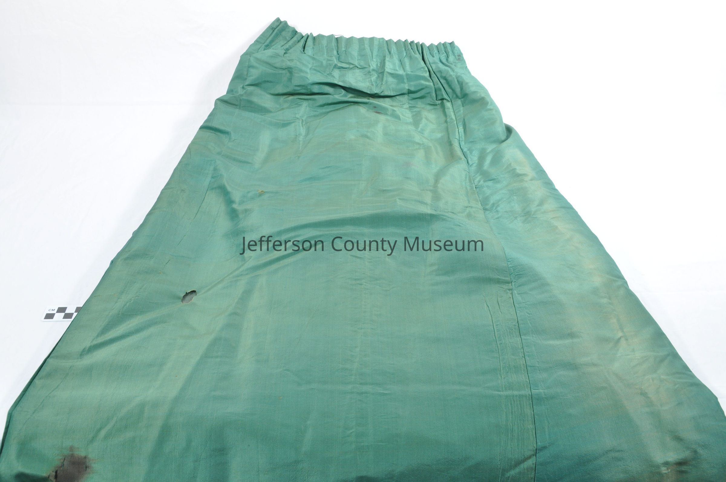 Two-piece green silk dress. Top has long sleeves with slit up to elbow. Sleeves have unusually wide cuffs. Top has hook and eye closures. Skirt is very voluminous and is lined with a dark green slick material. The bottom of the skirt is lined with a wide dark brown, square patterned material.