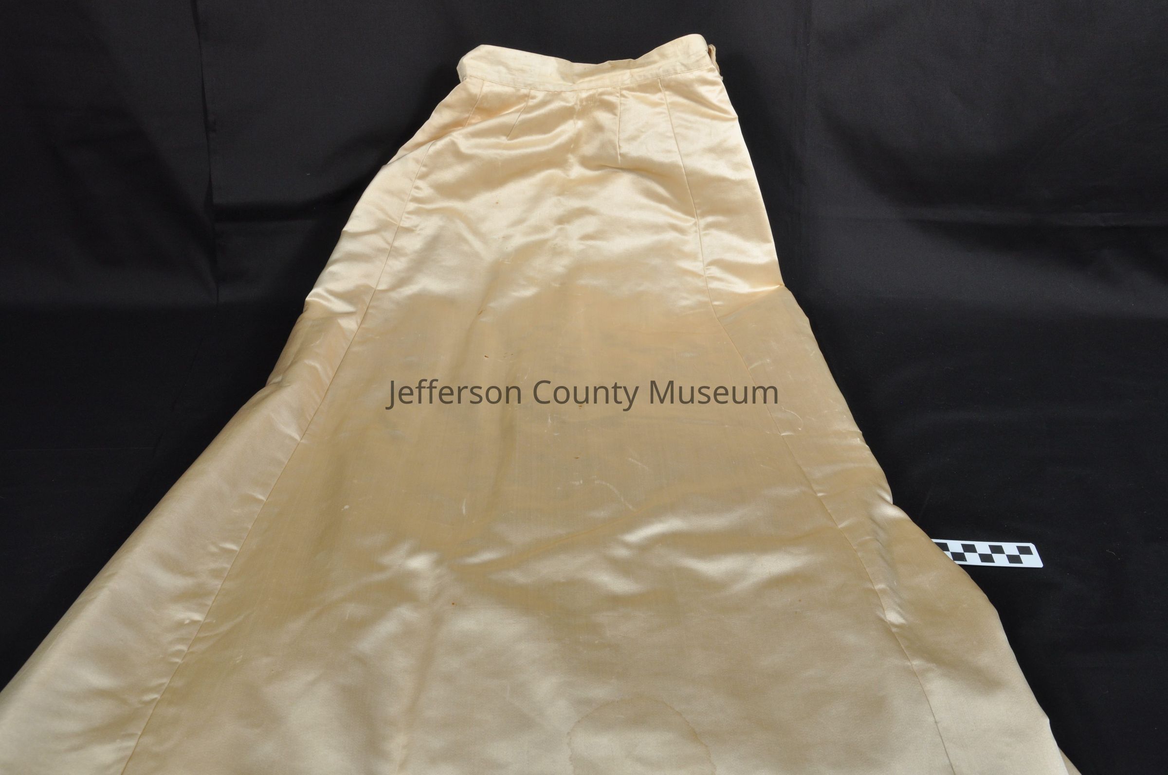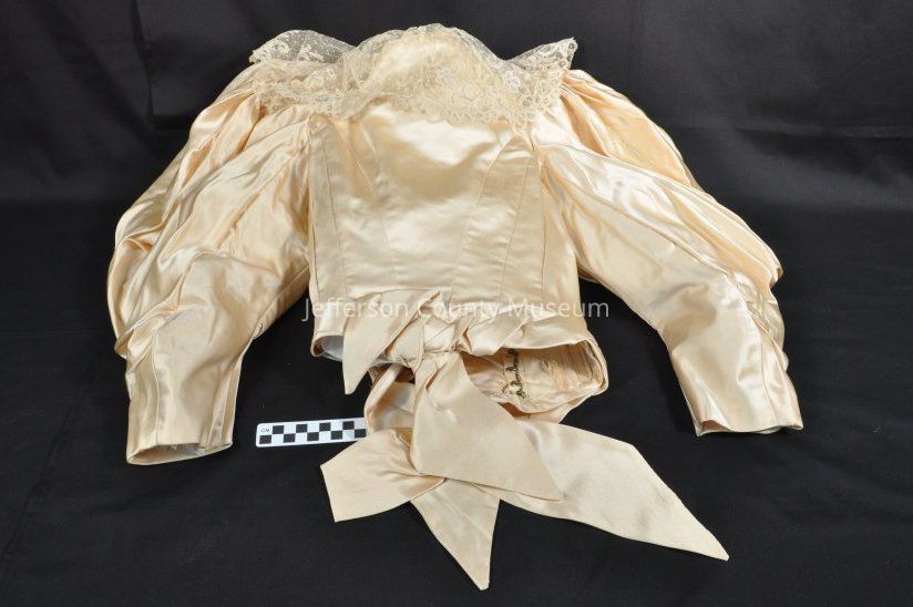 1809a - bodice; 1809b - skirt. Two-piece ivory silk dress, cream colored but was once probably white. Puffed "leg-o-mutton" sleeves. Bodice has deep lace down to waist and up around collar. Metal hook and eye closures sewn to front. Skirt is full length with train and heavy with a thick rolled silk hem over padding base. Cotton ties at waist.Acquisition