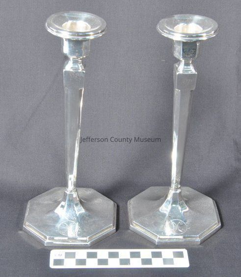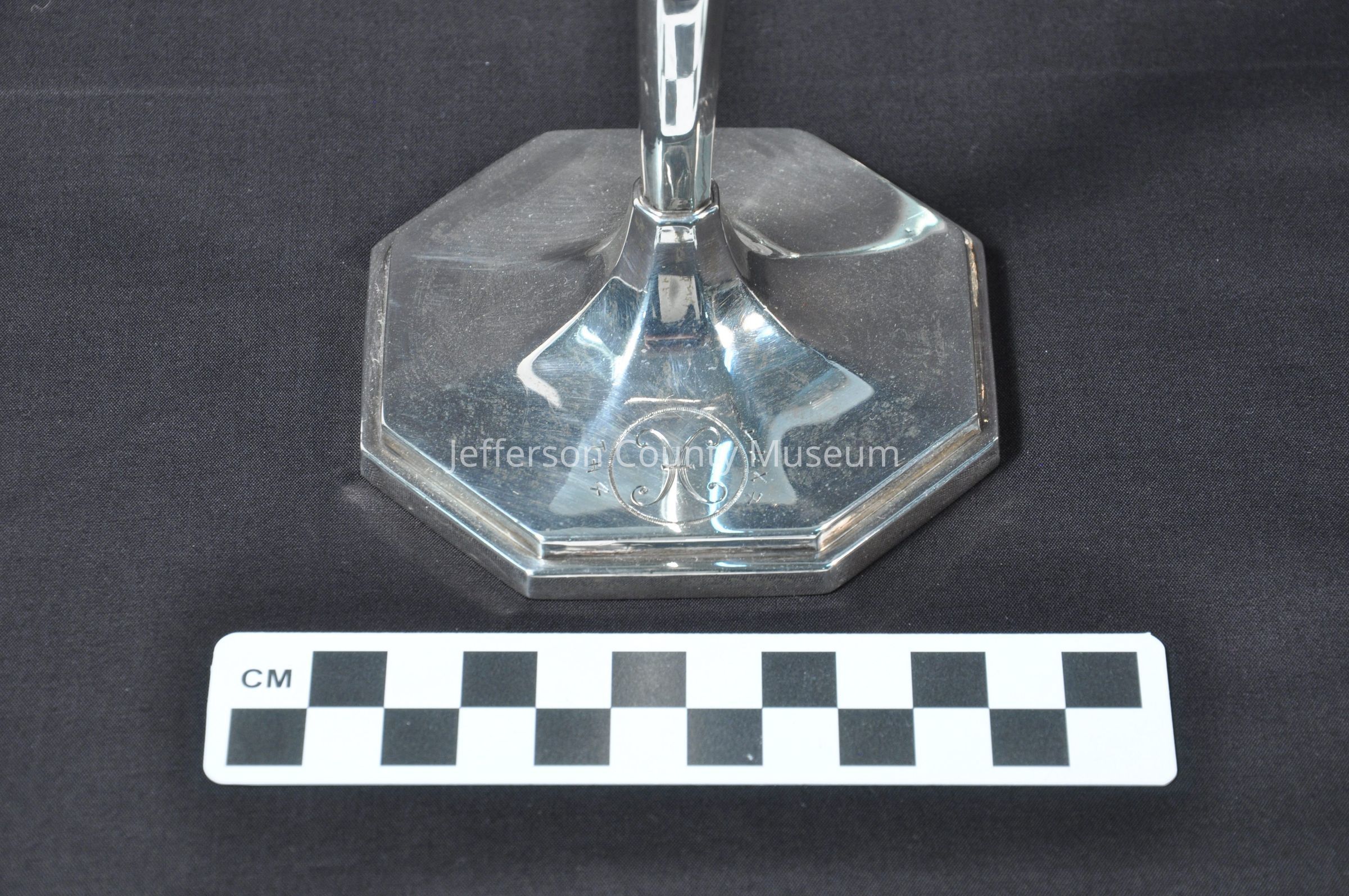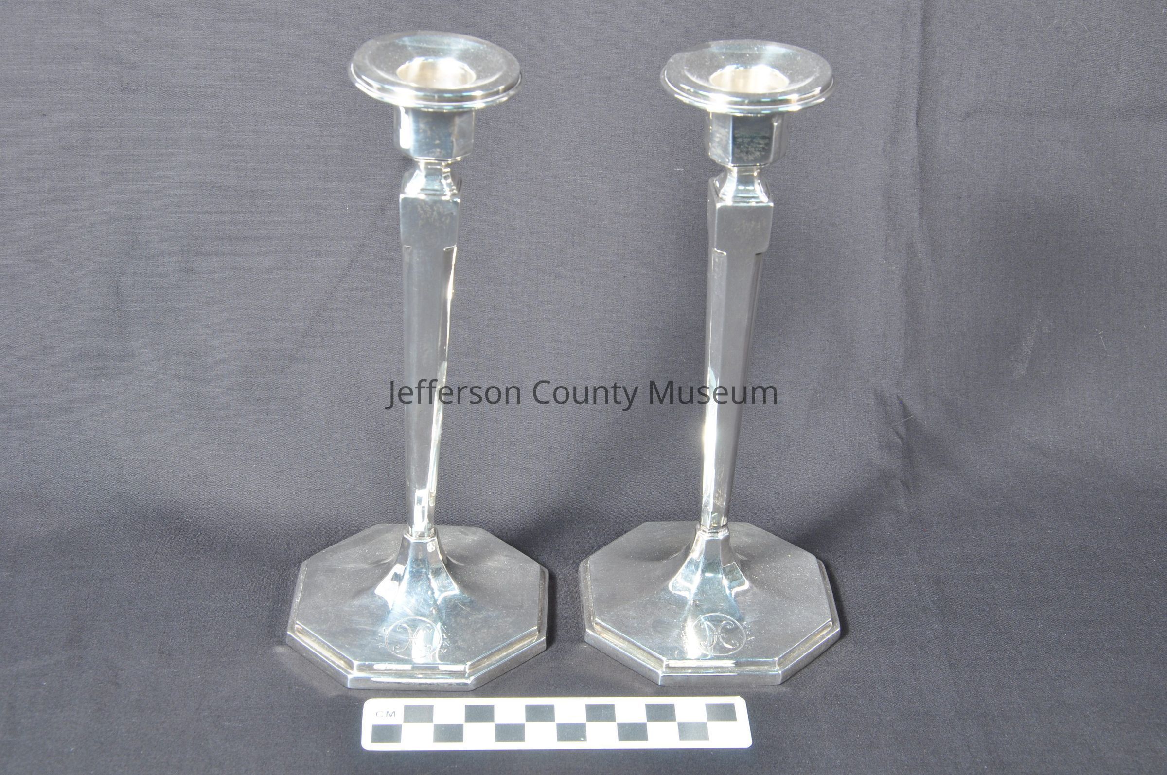 Early 20th century: two sterling silver candlesticks (a and b). Marked with fancy calligraphic "H" in a circle. Characters around circle may be "T H 4 H L X 7". On bottom "D" in oval over "STERLING 94" and "WEIGHTED". These candlesticks were awarded to Miss Louise Briscoe for academic achievement at Stuart Hall before World War I.Acquisition