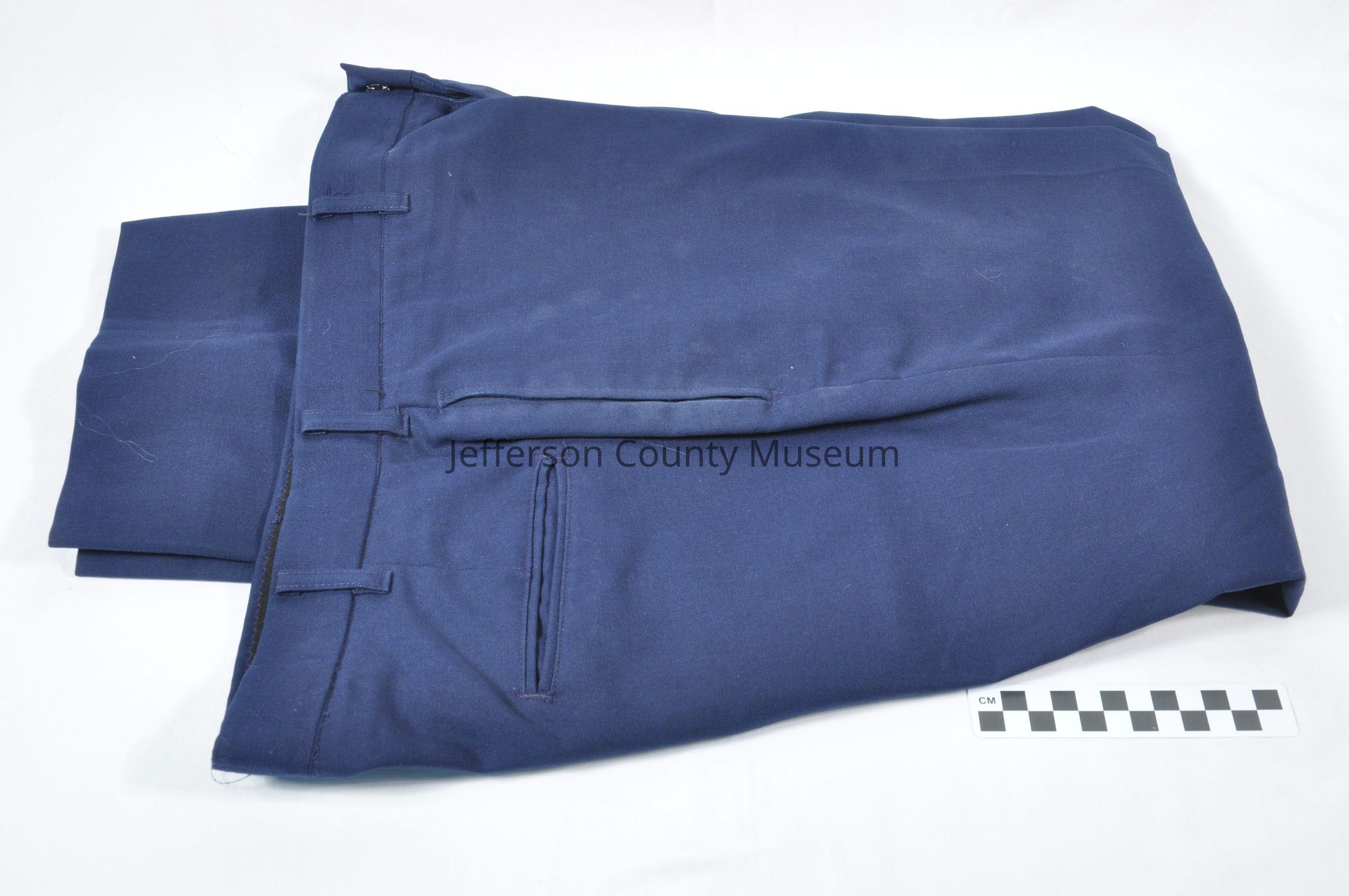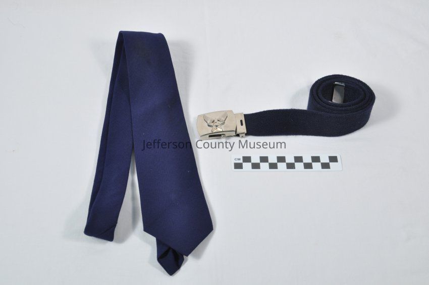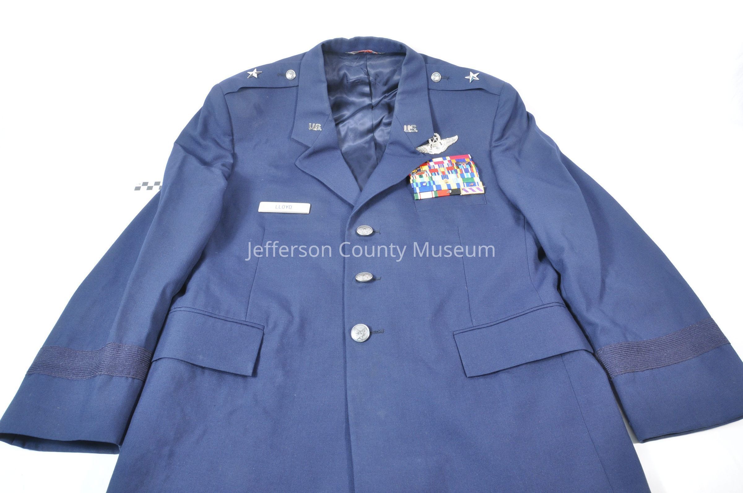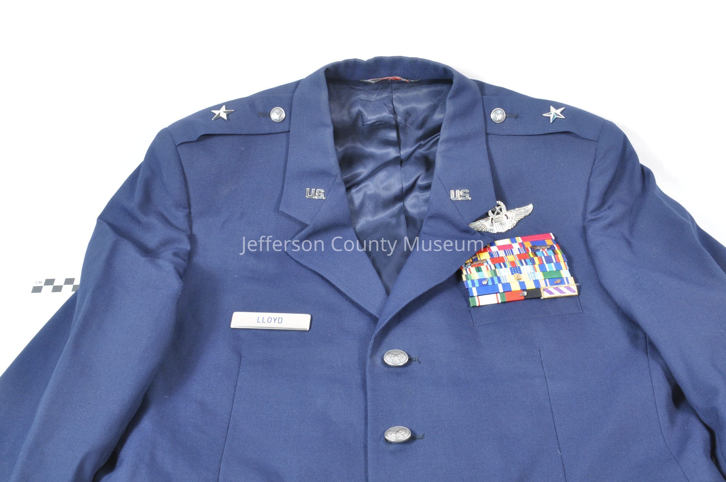 U. S. Air Force class A, dress blue uniform with tunic (a), pants (b), belt (c) and one necktie (d). Tunic has three dull silver Air Force buttons on front and smaller buttons holding each epaulet in place. On each epaulet is a silver brigadier general's star. On each lapel is a silver "U.S.". On the left side above the pocket are nine rows of ribbons. Above the ribbons is a silver pin of spread wings with a shield in the center. Above the shield is a star with a wreath around it. This is the insignia of a master pilot. On the right side is a silver name bar with "LLOYD" in blue letters, On the inside breast pocket is label with " ALLEGHENY MANUFACTURING". Pants have zip fly and four pockets. Left back pocket has button. On inside right waistband is label "34S". Sewn to inside right pocket is white label with red letters "Tennessee Apparel Corp. Tullahoma, Tennessee". Below that is standard military label with contract number, etc. Web belt has silver buckle with spread wings above a single star. Buckle is slide adjustable type. Necktie is blue, has three button holes for attaching to uniform shirt. Label on back side of large end "Smoothie BUTTON-DOWN TIE PUT SMALL END THRU HERE MADE BY SCHRETER". Label at bottom of tie is standard military tag with contract numbers, etc.Acquisition