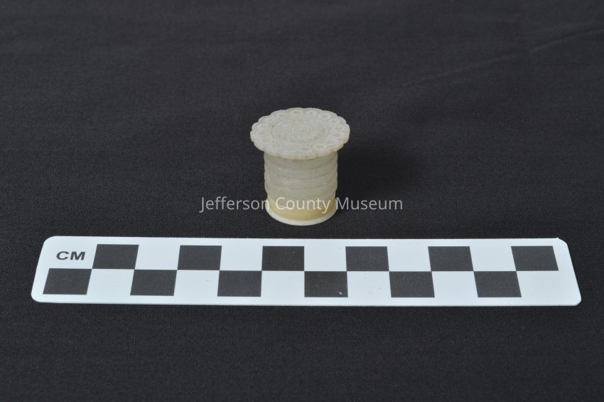 Wax cylinder with mother of pearl top. Fancy design carved into top. For waxing thread. Stored inside sewing cabinet (object #185)