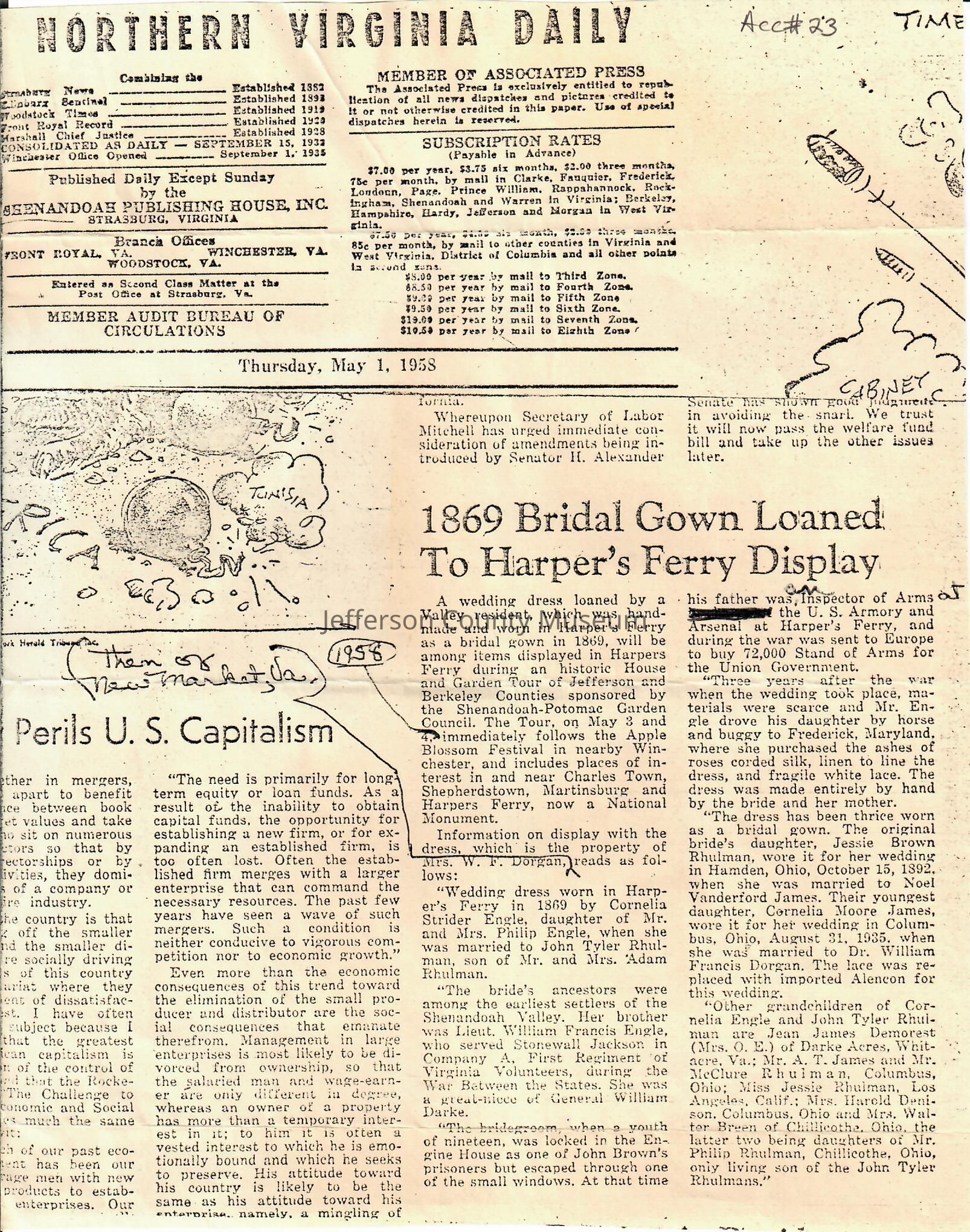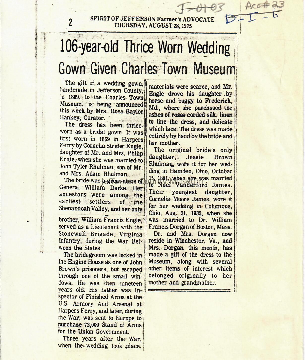 Made by the bride, Cornelia Strider Engle, and her mother, Sarah Strider Engle, this dress was worn by the bride in her wedding in Harpers Ferry in 1869 to John Tyler Rhulman who had been a hostage of John Brown in the engine house at Harpers Ferry. This dress was altered and worn in turn by Cornelia Strider Engle Rhulman's daughter, Jessie Brown Rhulman, and Cornelia Strider Engle Rhulman's granddaughter, Cornelia Moore James (the donor) at their weddings.Acquisition