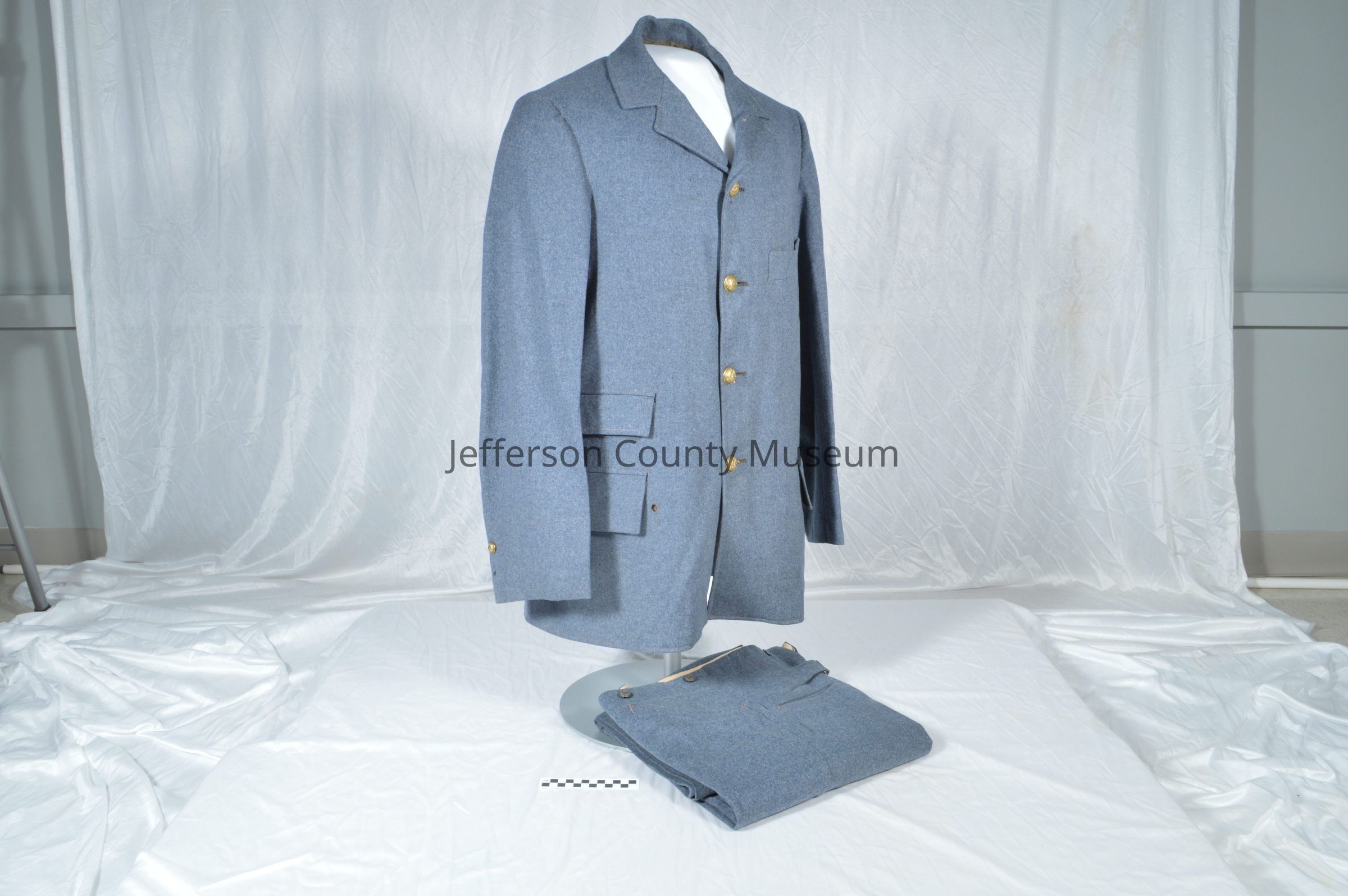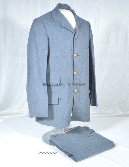 United Confederate Veteran uniform (jacket (a) and pants (b)). Blue-gray wool. Four buttons on front of jacket; two on left sleeve; one missing from right sleeve. Brass buttons wit "SIC SEMPER TYRANNIS" and the Commonwealth of Virginia official seal. Trousers have small wool belt sewn to back with metal buckle, three buttons on fly, and six suspender buttons around waist band. Jacket has four outside and one inside pockets. A tobacco plug was in an outside jacket pocket wrapped in kraft paper. Plug is 7.5 cm square and 3 cm thick. Pants have two regular front pockets and one watch pocket. Two pockets on back of trousers.Acquisition
