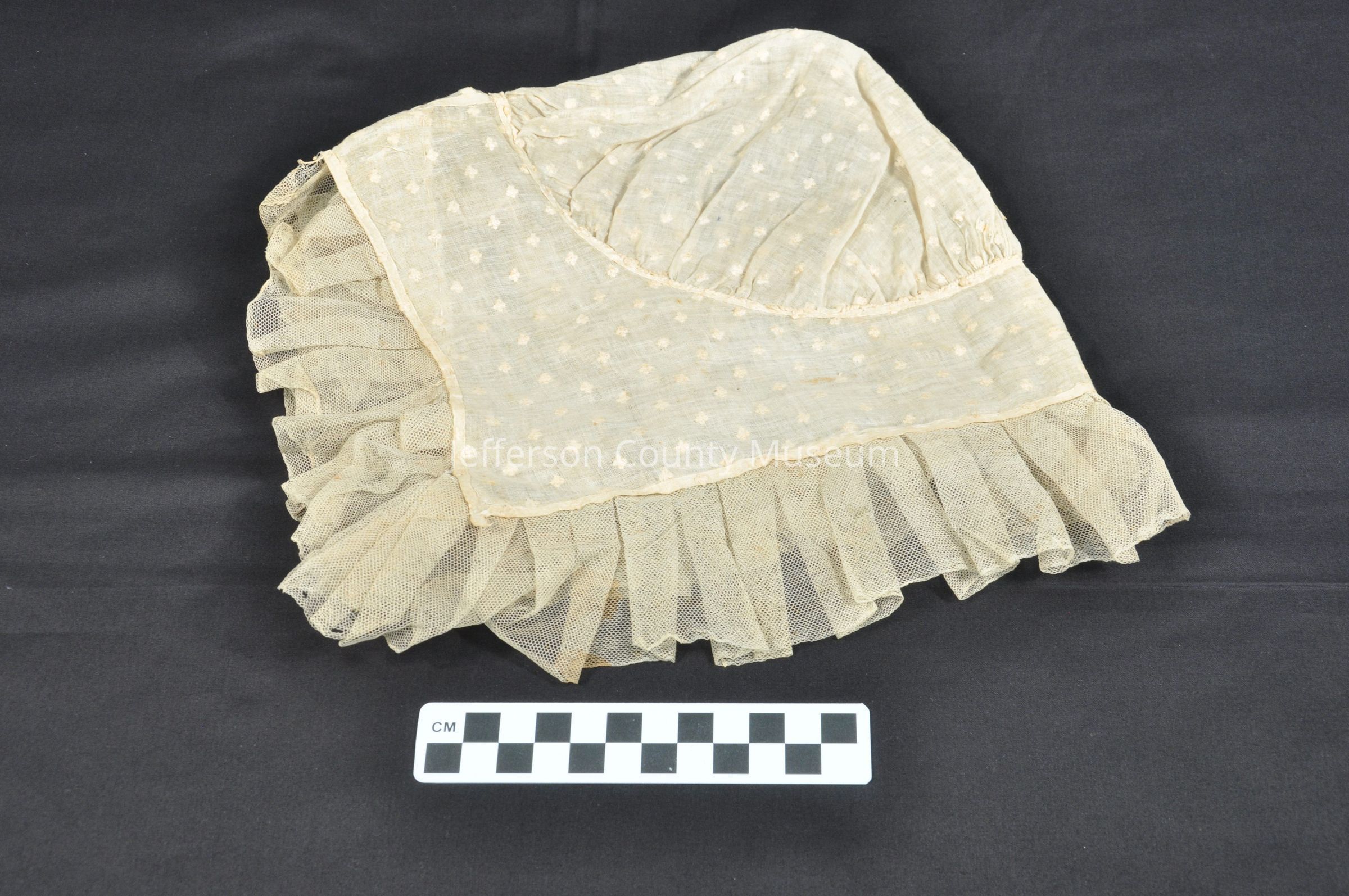 Handwritten in pencil on slip of paper with cap: "Wedding Night Cap - made & worn by Mary Eliza Bowen. Displayed at Historical Society May 21, 1938"Acquisition
