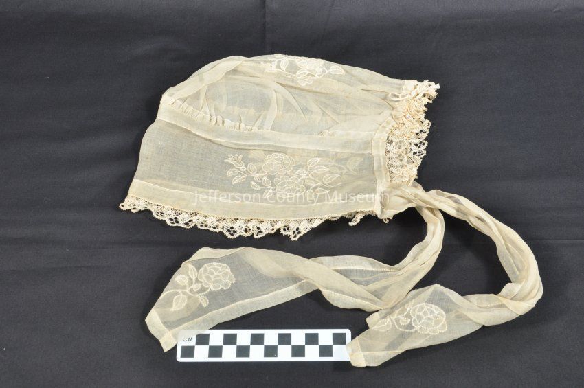 Woman's thin cotton day cap with ties to hold it on. Floral designs on both sides and back. Tatting around edges. Was once probably white but has now yellowed.Acquisition