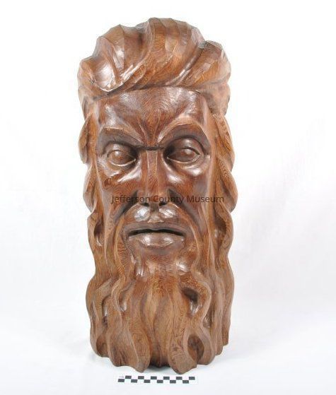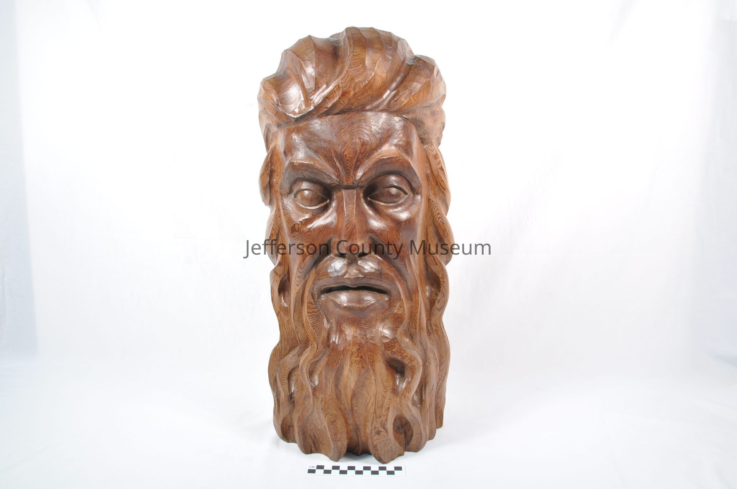 Wood carving of bust of Moses with flowing hair, large moustache and furrowed brow. Dark wood. Carved on right side in script "J.Segeren.".Acquisition