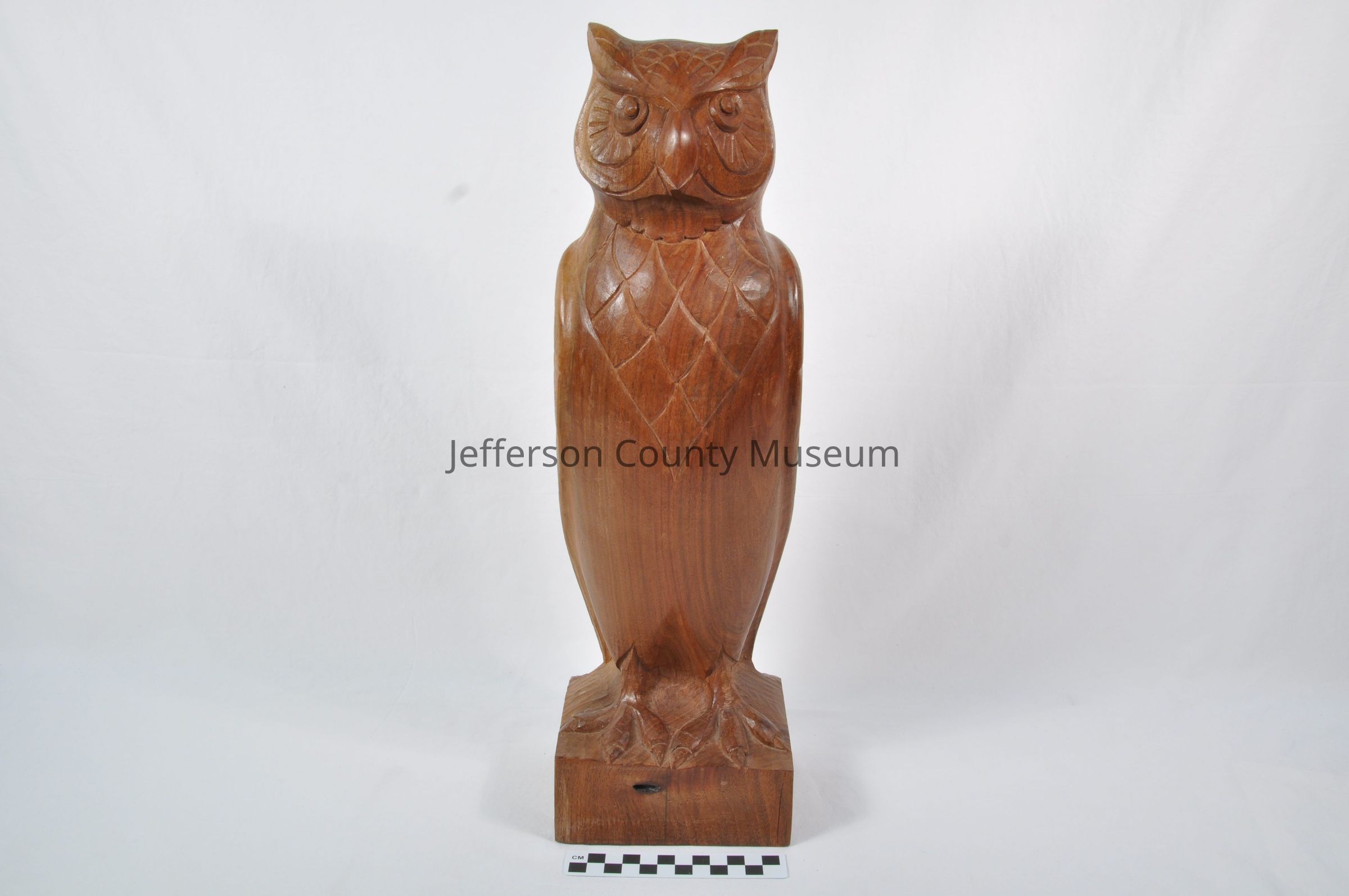 Wood carving of owl standing in upright position. Intricate in detail down to the feathers. Wood is dark in the front and lighter toward the back.Acquisition