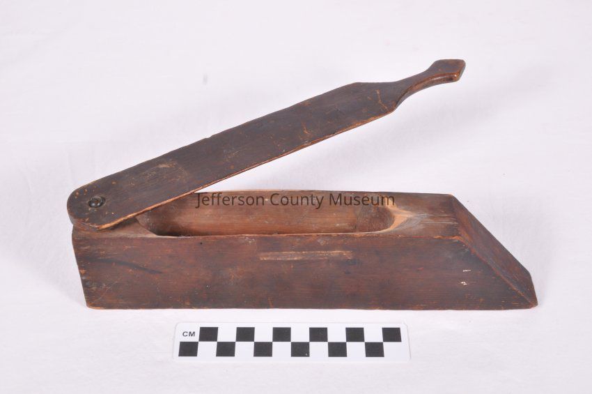 Wooden turkey caller. Has hinged top that swings back and fourth across a hollow wooden box. It is a rectangular shape. Probably American. Circa 1880-1900.Acquisition