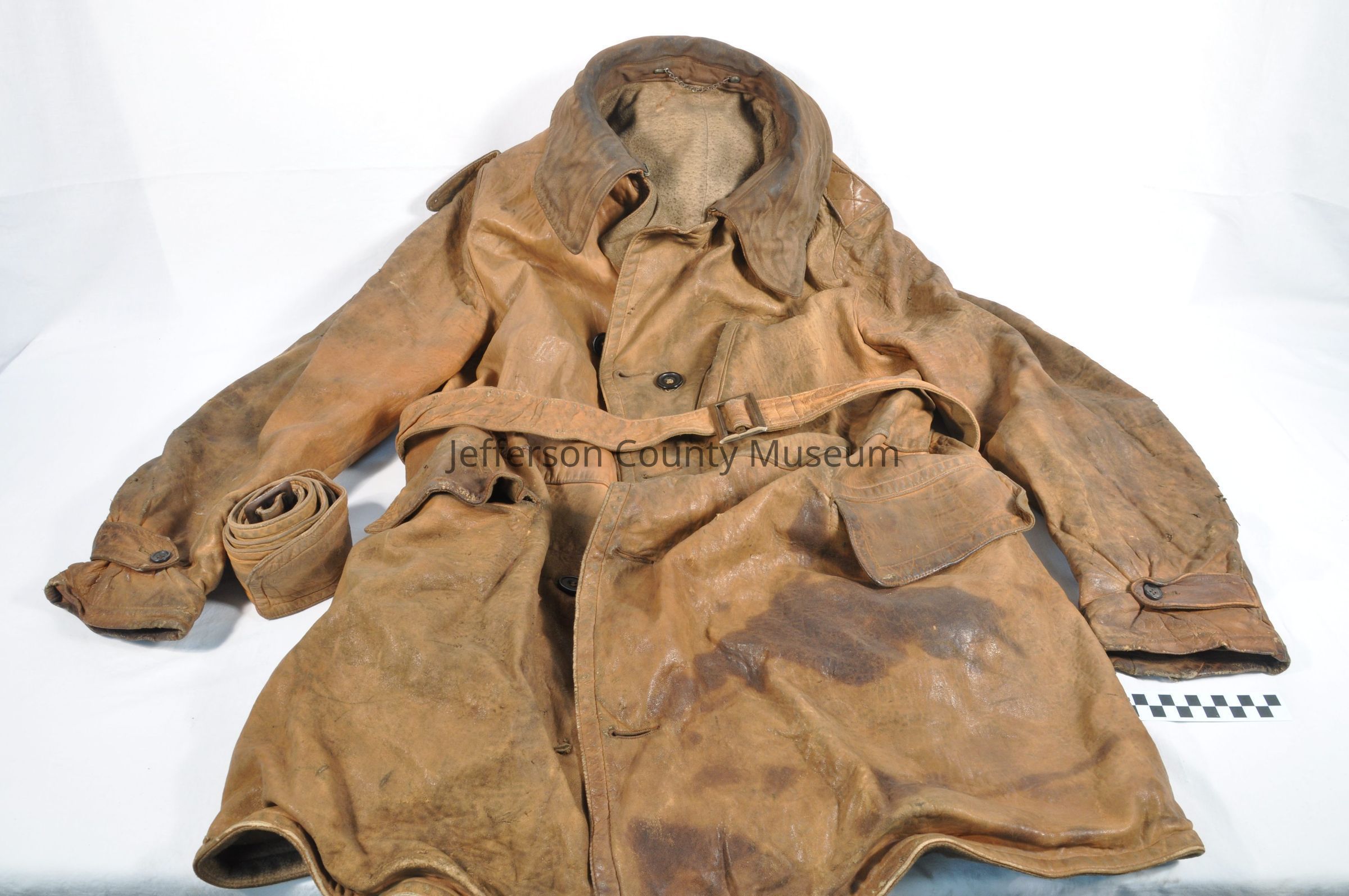 World War I leather aviator's coat, heavy light brown leather, lined with flannel. Belt with brass buckle. Two large pockets and slash pocket on left side. Leather epaulets on shoulders. Chain hanger at neckline inside.Acquisition