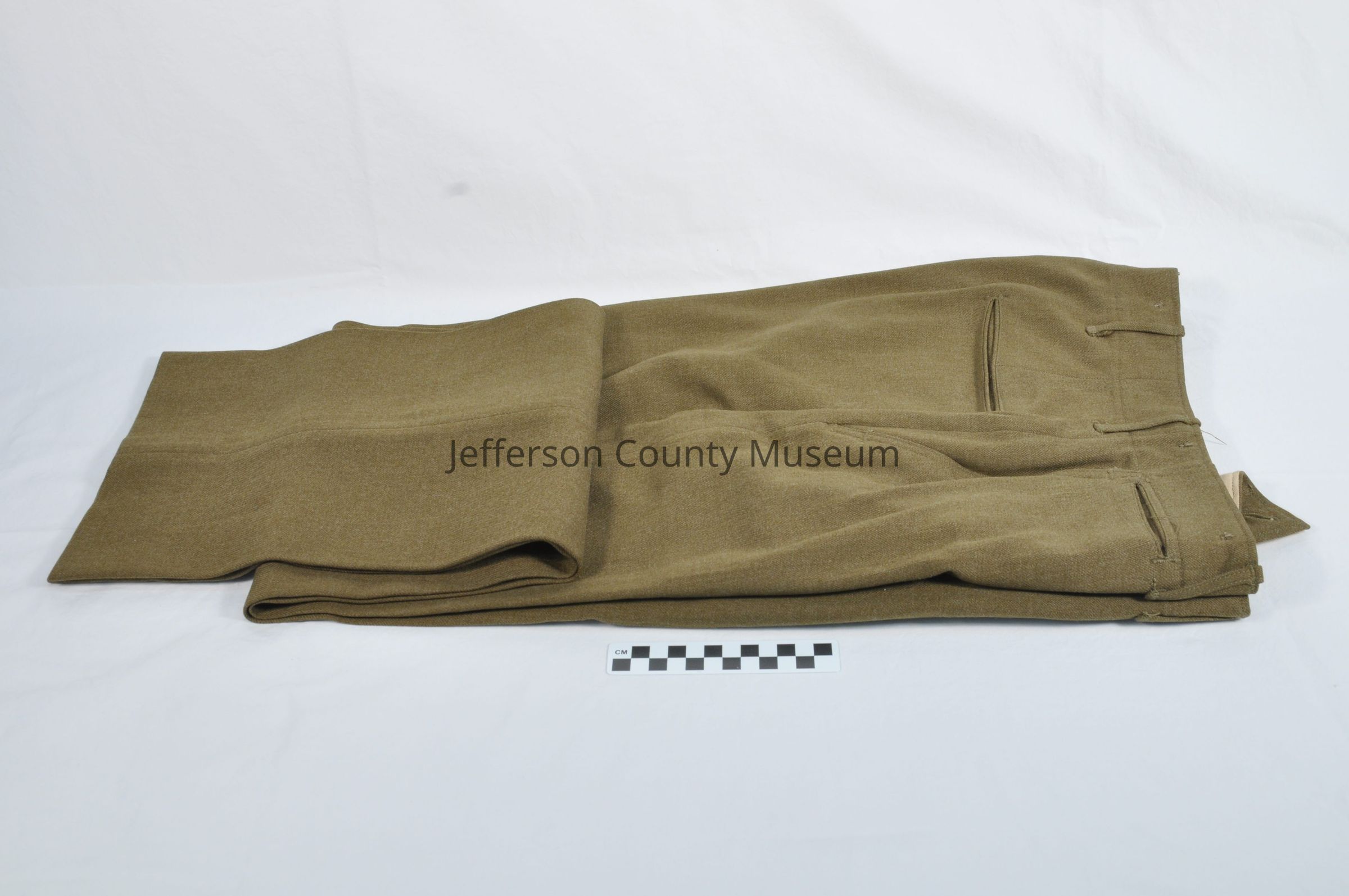 World War II OD (olive drab) brown winter uniform pants. Button fly with wide inside panel for warmth. Seven buttons inside at waistline. Label inside at waistline "W 32 L33". Five handwritten and stamped laundry identification numbers on inside right pocket. Also handwritten is the number "B8431".Acquisition