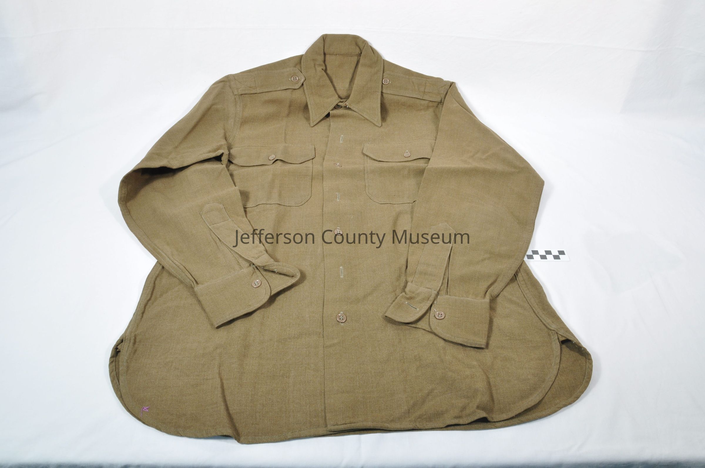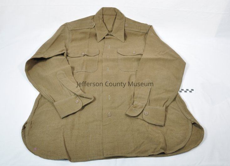 World War II (WWII) OD (olive drab) brown long-sleeved uniform shirt with flap button pockets and epaulets. No insignia or patches.Acquisition
