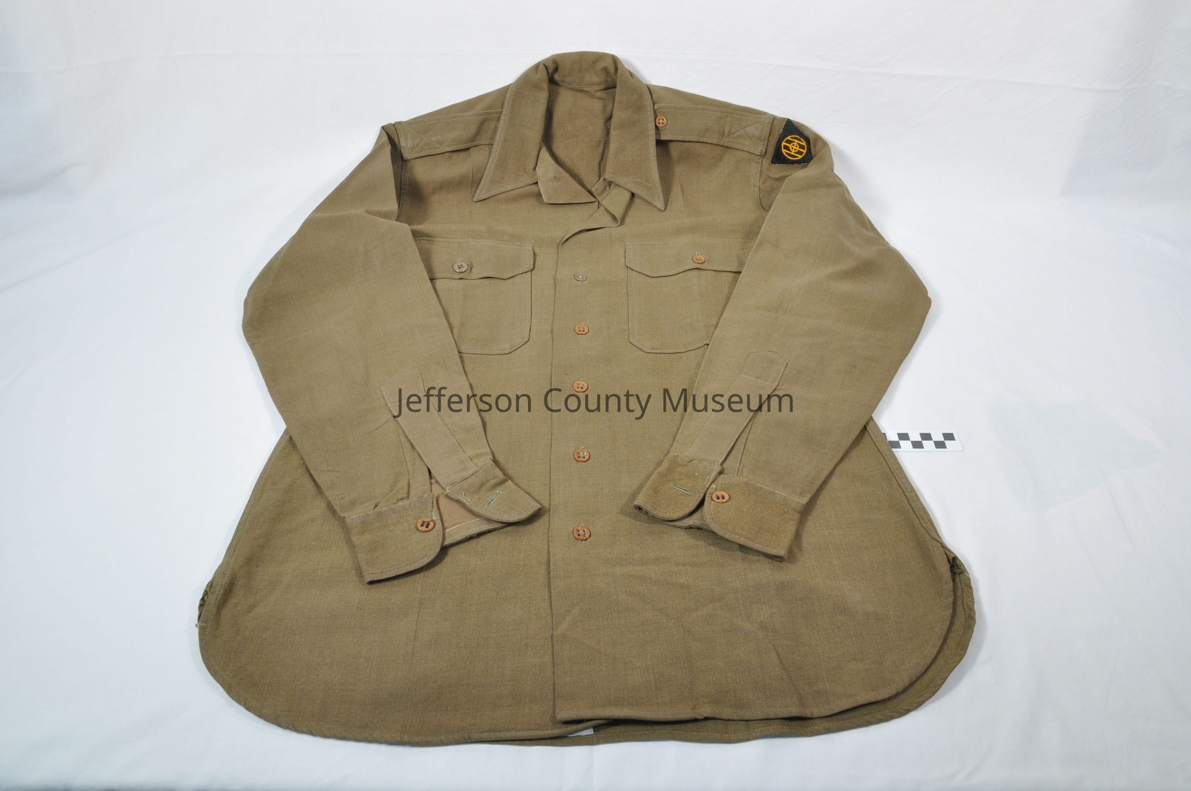 World War II (WWII) OD (olive drab) brown long-sleeved uniform shirt. Flap button pockets, epaulets, and black triangular patch of the 83rd Infantry Division on left shoulder. Patch has a circular yellow design on it.Acquisition