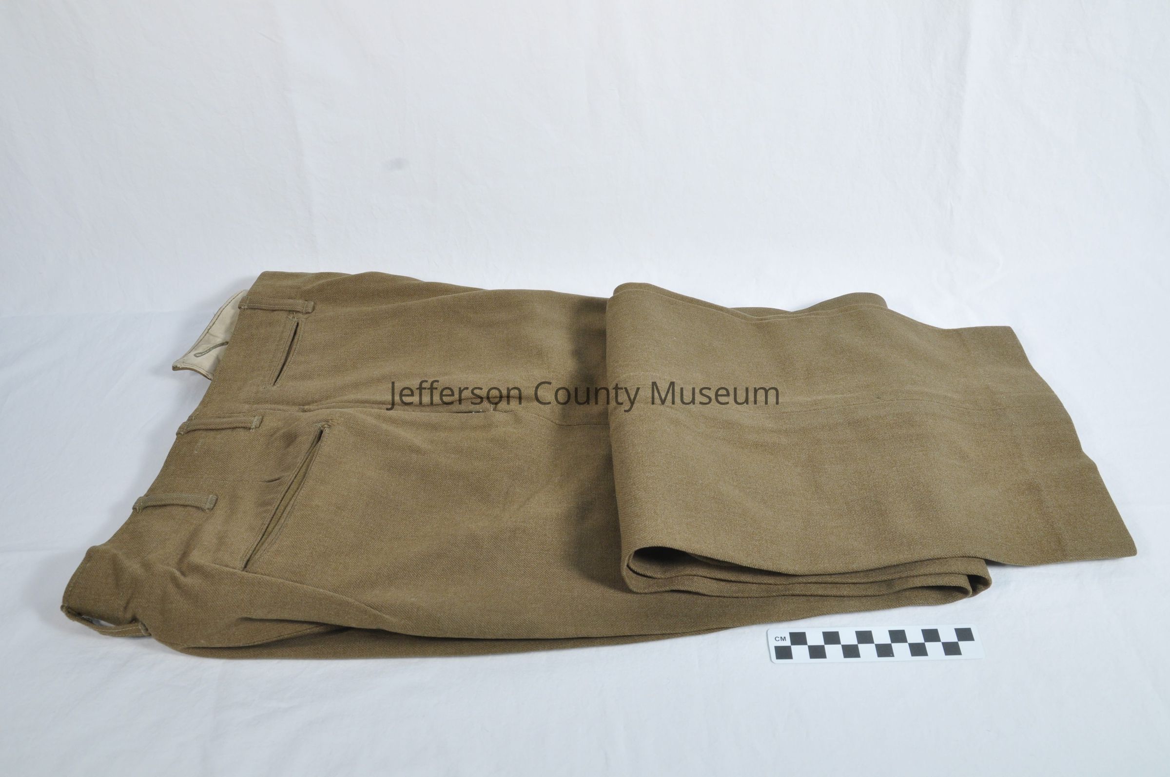 World War II (WWII) OD (olive drab) brown uniform pants. Button fly, belt loops. Small label inside near belt line "W32 L35".Acquisition