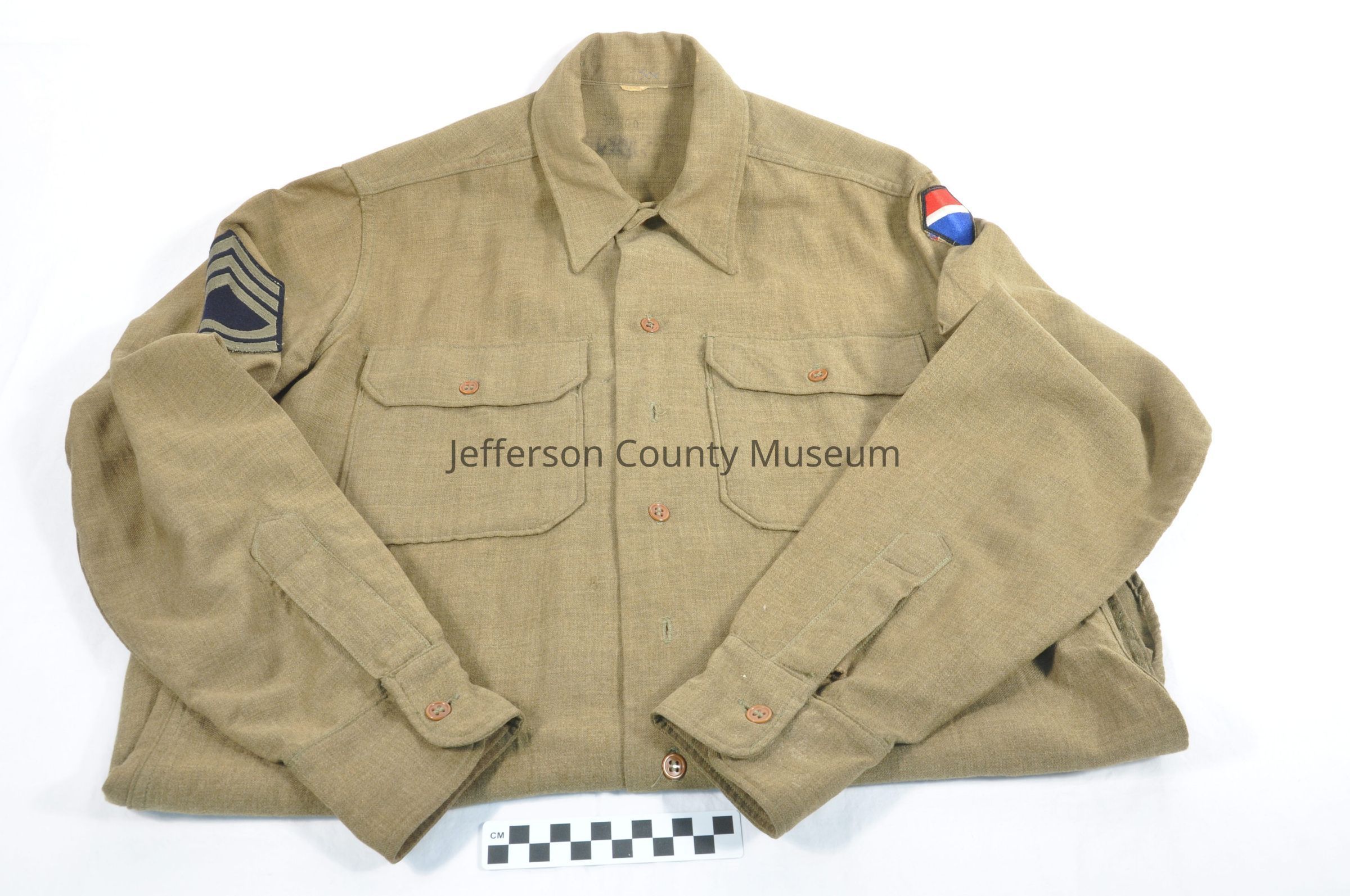 World War II OD (olive drab) long sleeved winter shirt with flap pockets and 12th Army Group patch on left shoulder and sergeant first class stripes on both sleeves. The patch is five sided, red, white and blue with a long point going downward. The inside of the shirt has a large woolen flap that buttons on the inside for additional warmth.Acquisition